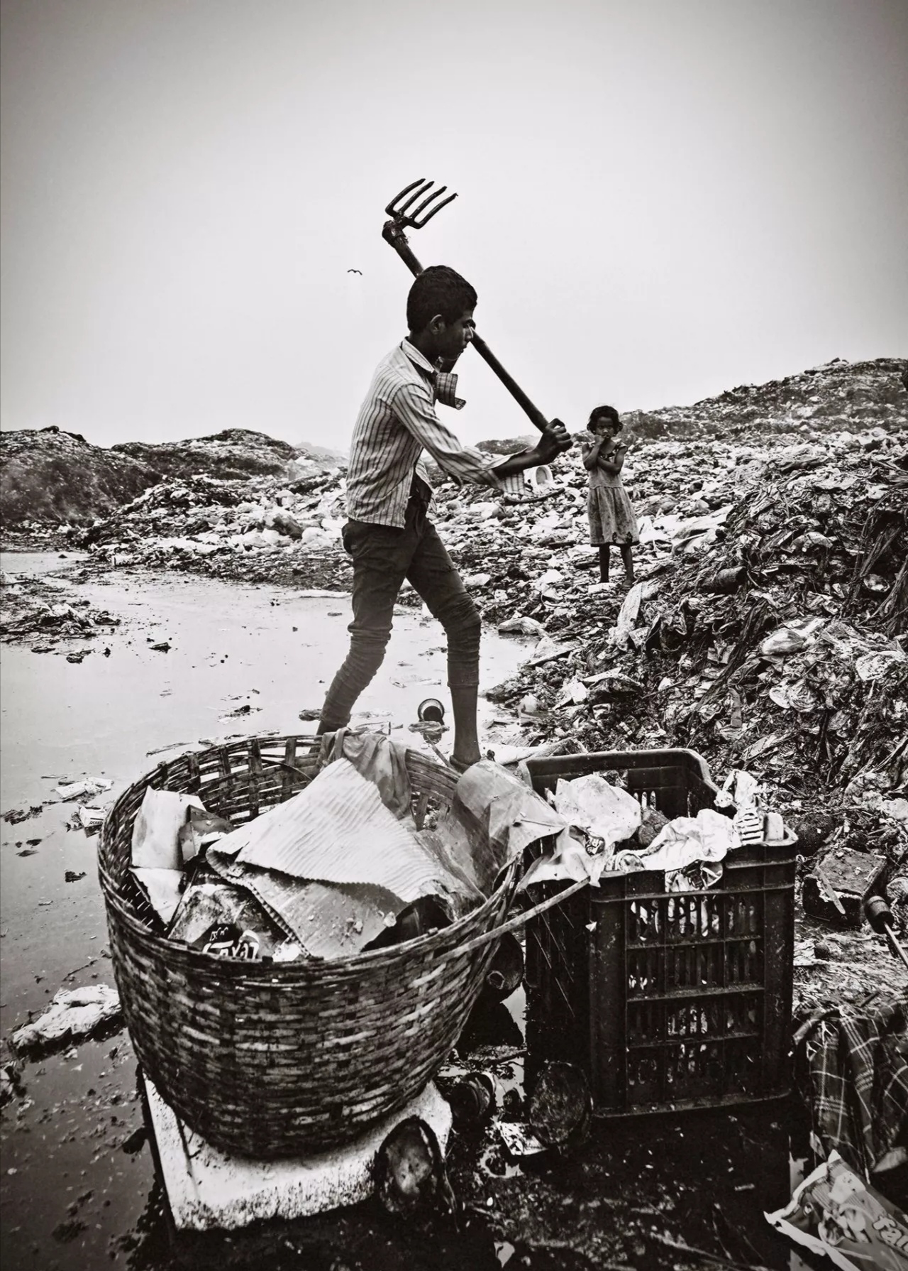 在垃圾场里有许多拾荒者在“淘宝”,有老人也有孩子,拍摄过程中注意到在垃圾山上有就地取材搭建的帐蓬,有送饭的妇女和孩子,他们就坐在垃圾上吃饭,休息,也许晚上就住在垃圾山上。在他们看来这就是他们的生活,他们麻木,他们习以为常。在垃圾中最显眼的是五颜六色的塑料袋,这些都是不可降解的物质,就算埋上几百年也不会消失。
