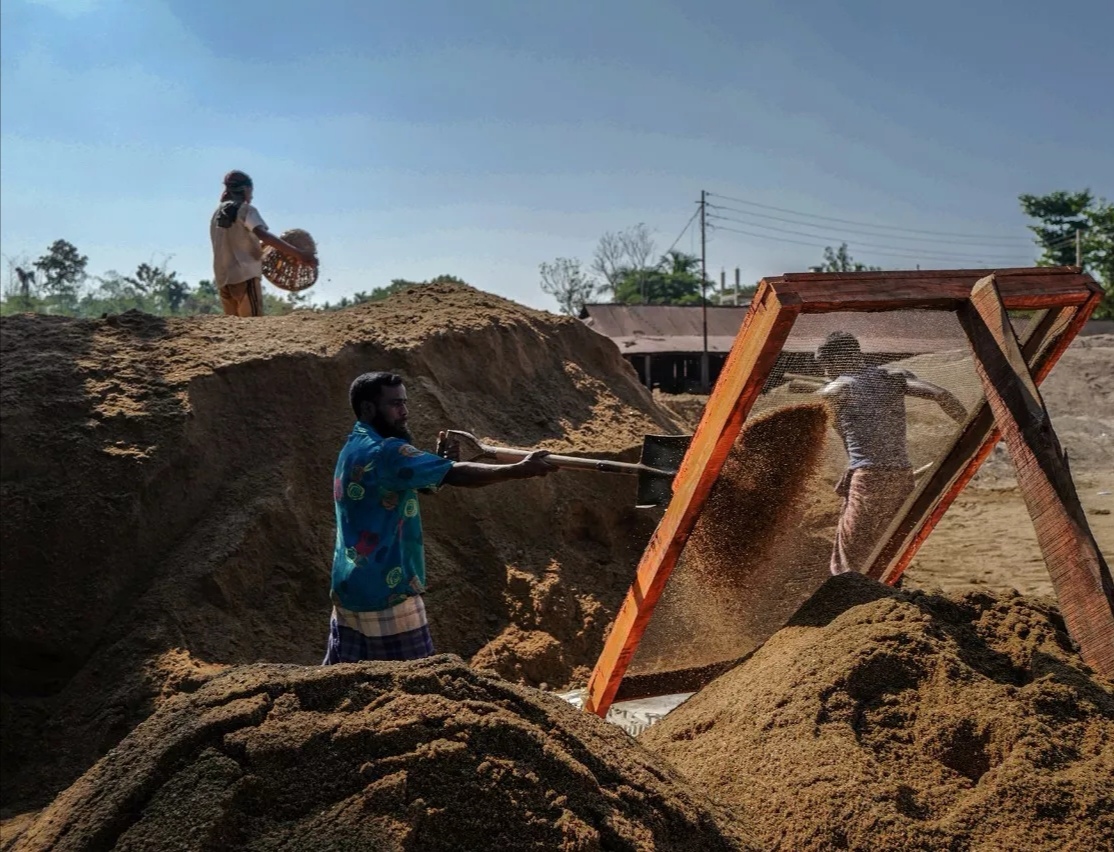 孟加拉多为洼地,少山多水,特殊的地貌环璄,使的各种石料奇缺。由于建筑的需要,一般两种方法解决,一是烧制砖块,二是淘沙选石。所以孟加拉砖厂遍地,也有大量的人员挖沙釆石。