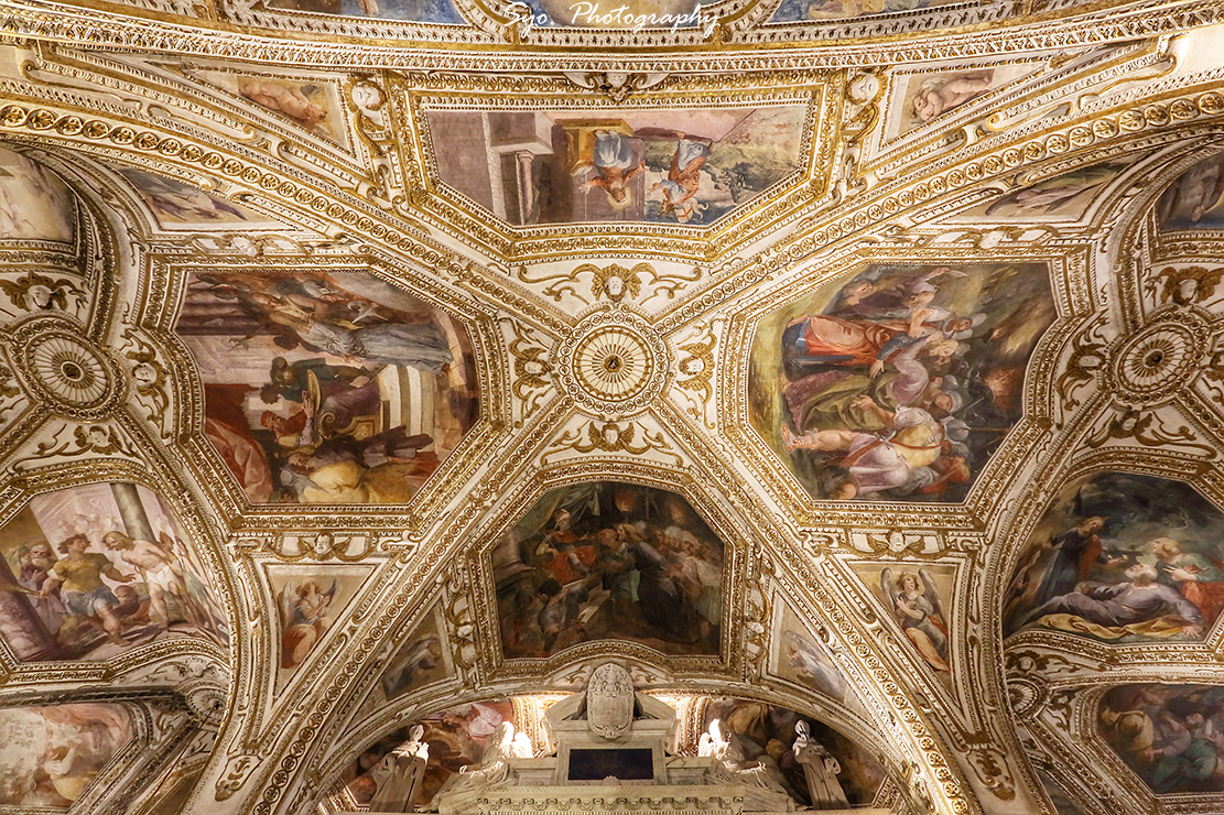 不过最珍贵的宝贝却都在教堂的地穴里,那里存放着耶稣的第一个门徒---圣安德鲁的遗骨。圣安德鲁是圣彼得的兄弟,当年传教至小亚细亚,被钉死在十字架上殉道。死后被埋葬在拜占庭帝国的首都康斯坦丁堡(如今的伊斯坦布尔),康斯坦丁堡沦陷之后遭到洗劫,信徒们就把他的遗骨带回意大利,在此安葬。教堂地穴一眼看去就气派非凡,可惜藏有遗骨的匣子无缘得见,据说只有在重要的宗教活动中才会拿出来陈列。圣安德鲁是阿马尔菲的保护神,教堂各处都有关于他的雕塑和壁画,小镇广场的喷泉旁也有他的雕像,这个圣徒很好认,他背后的十字架是斜的,呈X型。