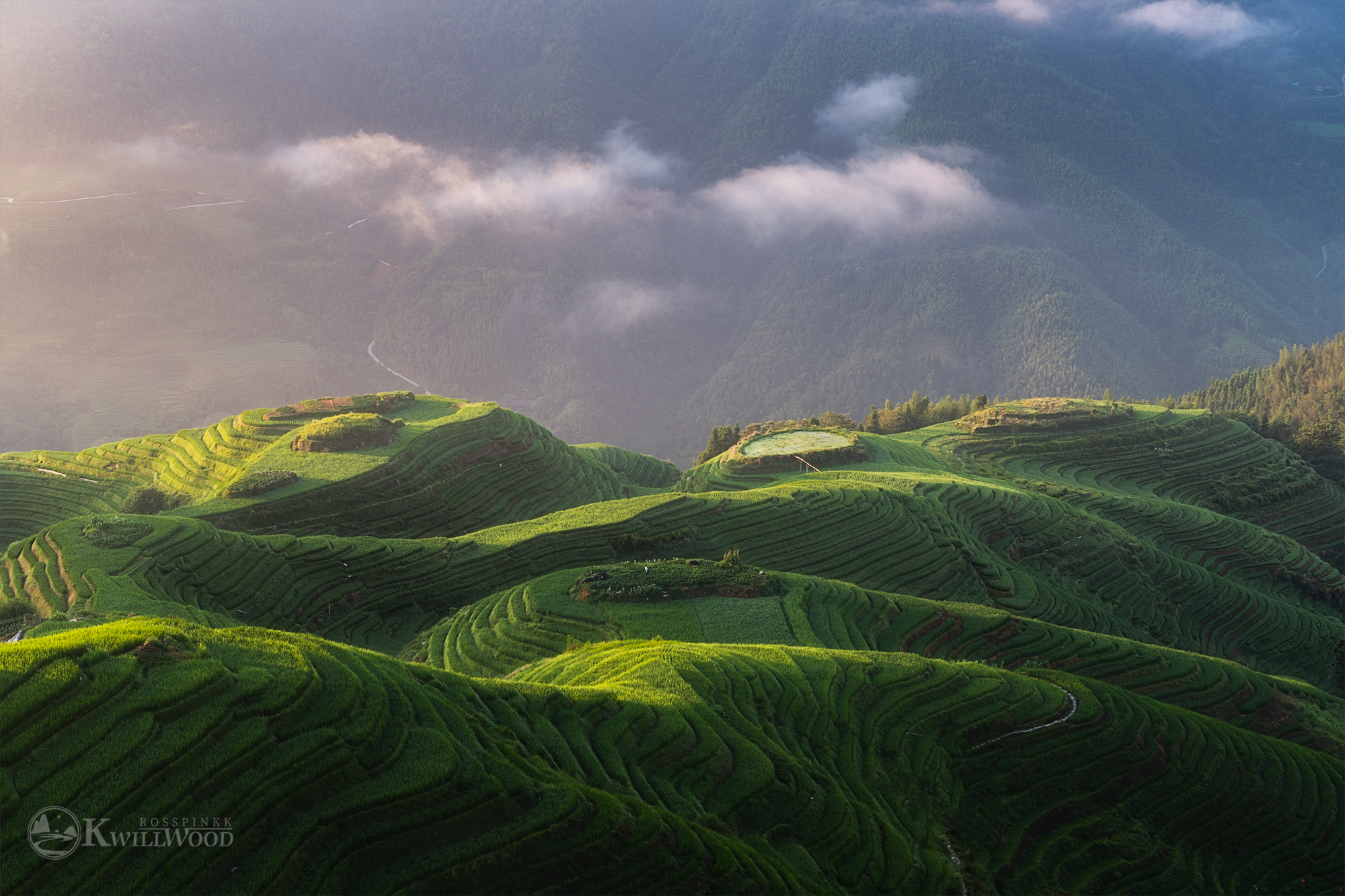 放眼望去,梯田好美,就像一幅夏天的图画,晨光将绿油油的梯田勾勒出千万条,天空中少许的云朵,点缀着龙脊梯田。
