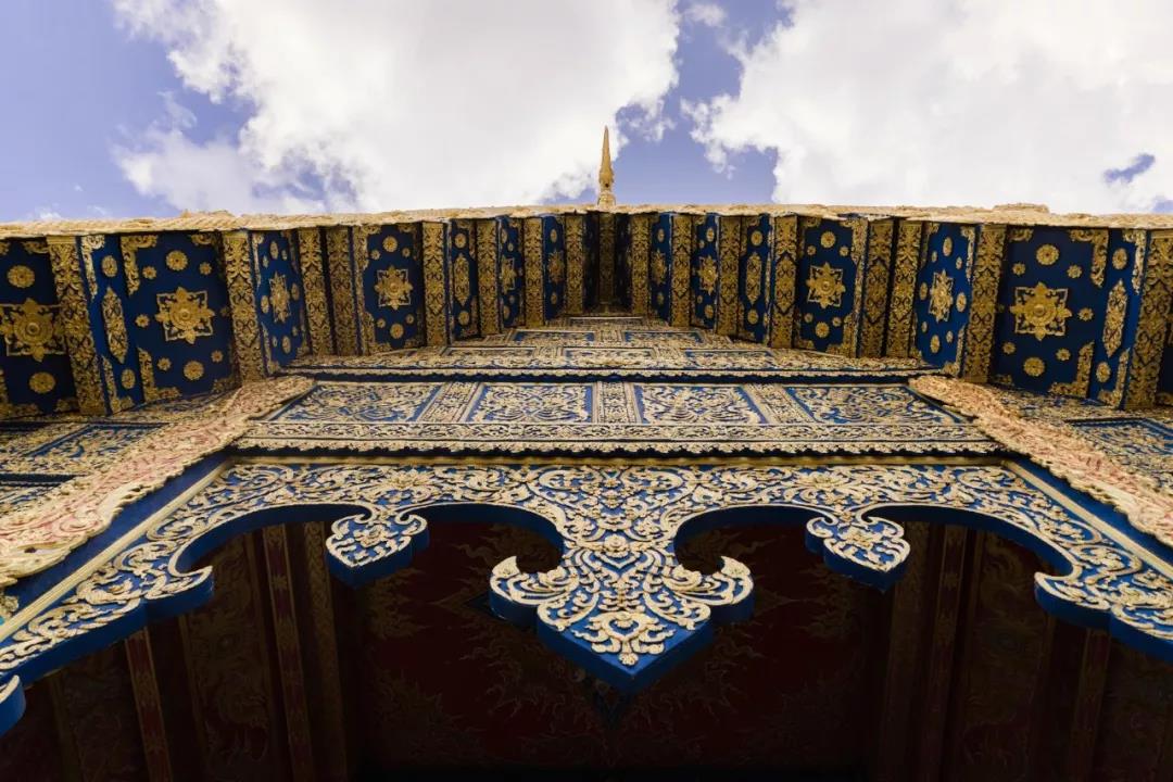 蓝庙的蓝色很深邃,但是又不厚重。外观的木质雕刻精美繁复,门前两飞条的龙鳞也是五彩绚烂。