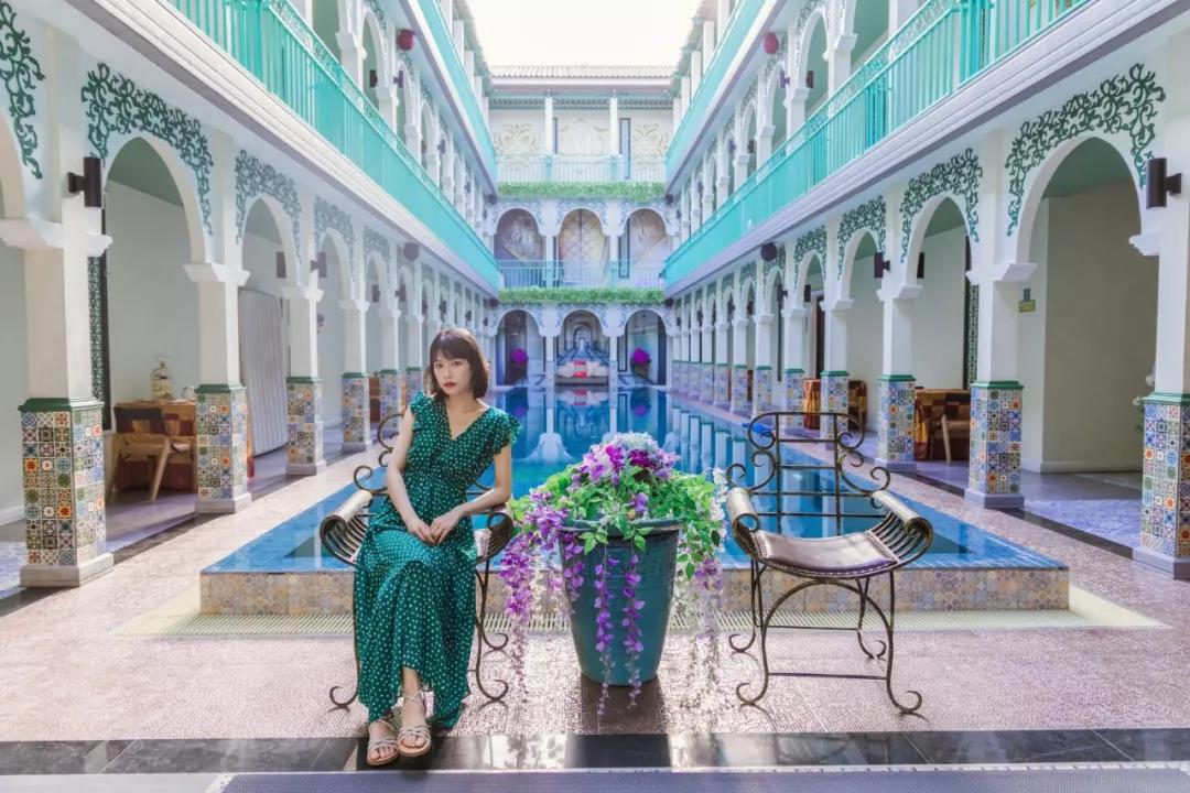 一进入The Grand Morocc Hotel,仿佛让我有一种来到摩洛哥的错觉。建筑正好倒映在泳池里,类似拱门的结构形成了对称美。