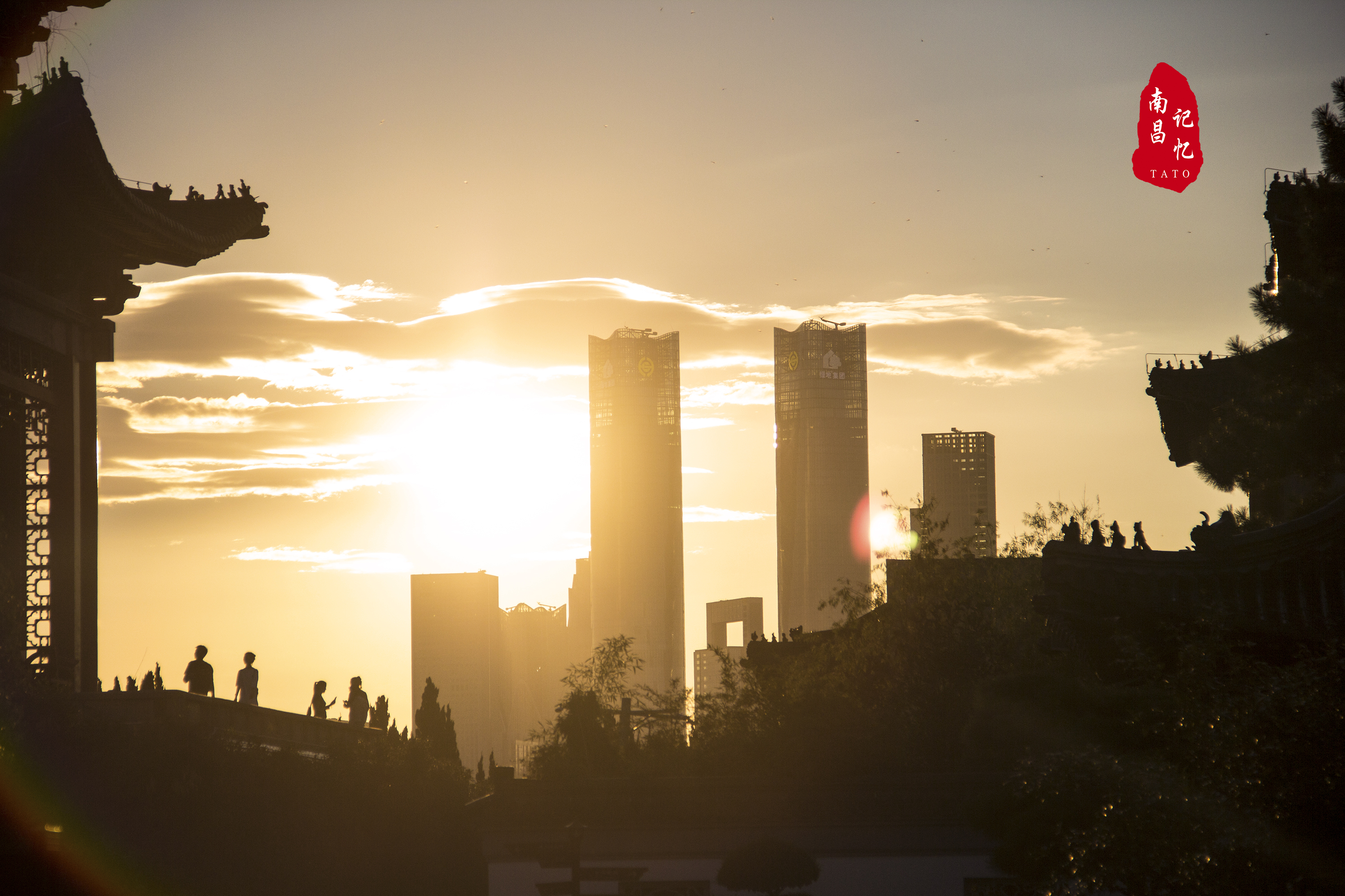 从滕王阁下来,太阳也要落山了,站在广场上,此刻的滕王阁是最美的,“落霞与孤鹜齐飞,秋水共长天一色”,八月底正好是秋季,今天又正好遇见了晚霞,王勃的诗篇,描绘的正是此情此景吧。