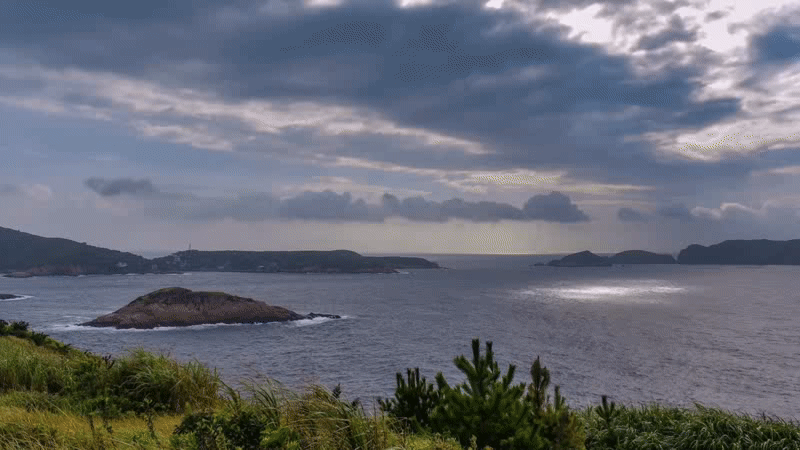 回到客栈,在我的房间门口架起了相机拍延时,正好是碰到了日落时分,远处的防海堤掀起的浪最高能有8-10米,台风真的影响很大,可以看到雨已经向我们飘来了。