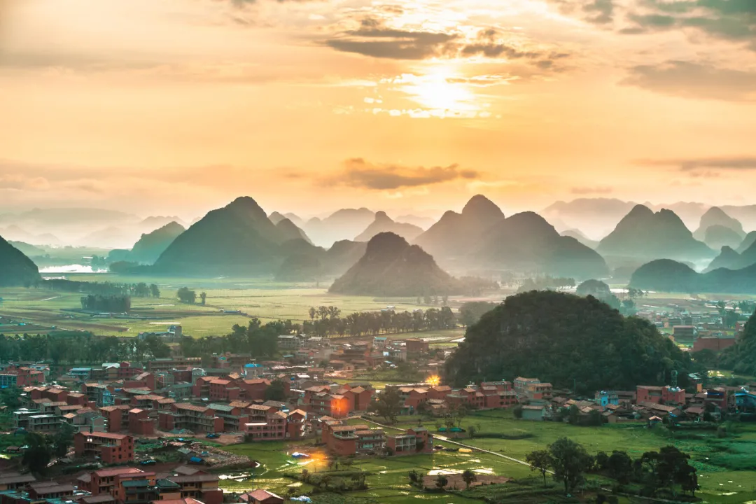 到了秋天,群山被夕阳给吞噬,远方云雾缥缈,就像是被一幅上了色的水墨古画。小湖里还有荷花,划着小船顺着小湖一直流浪,感受秋日中色彩斑斓的景色,抛掉一切杂念,静静感受这里的惬意人生。