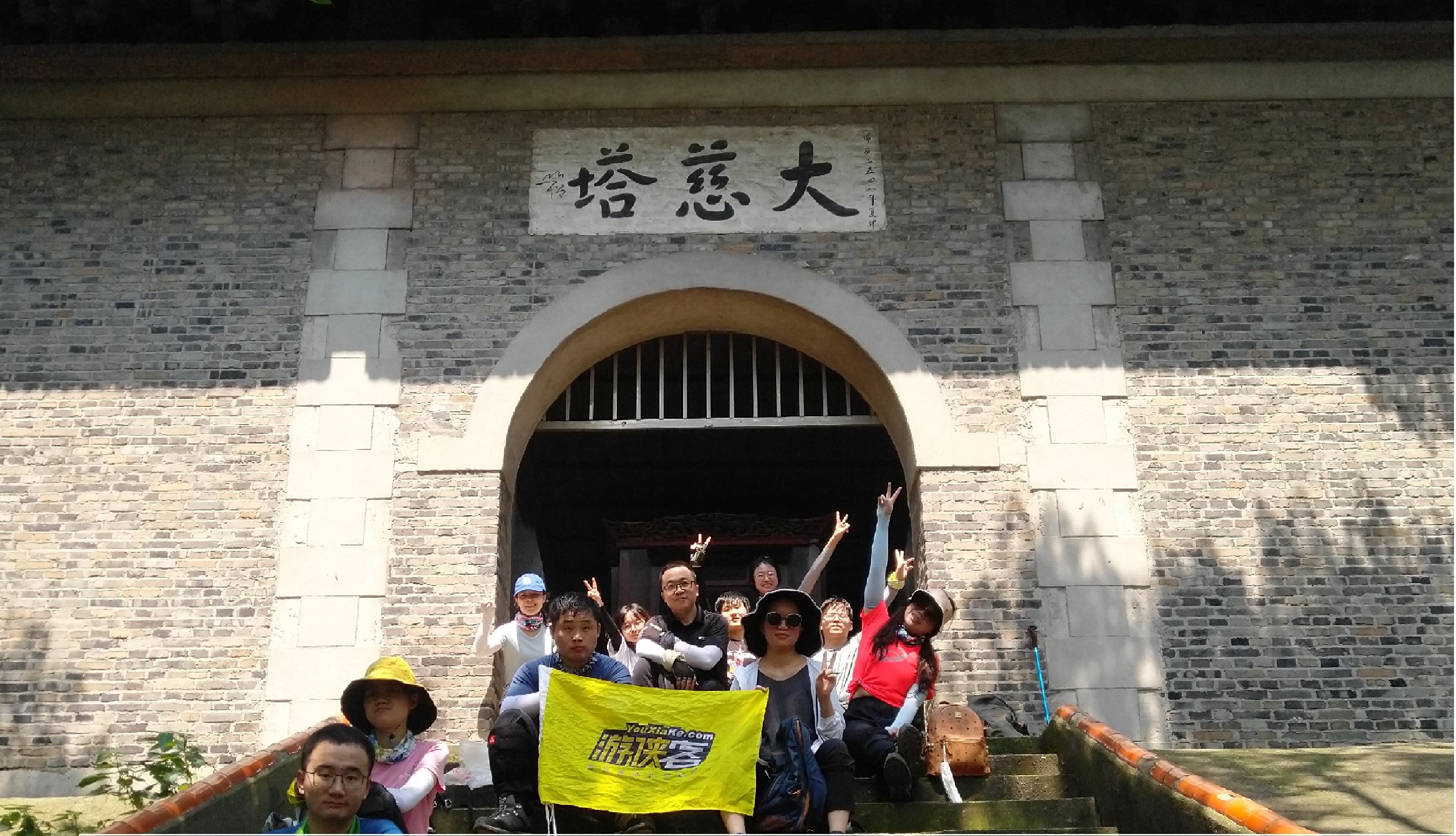 下狮子岭,于11:08来到兜率寺大慈塔,在此稍作休息并路餐,队员们相互分享随身携带食物。