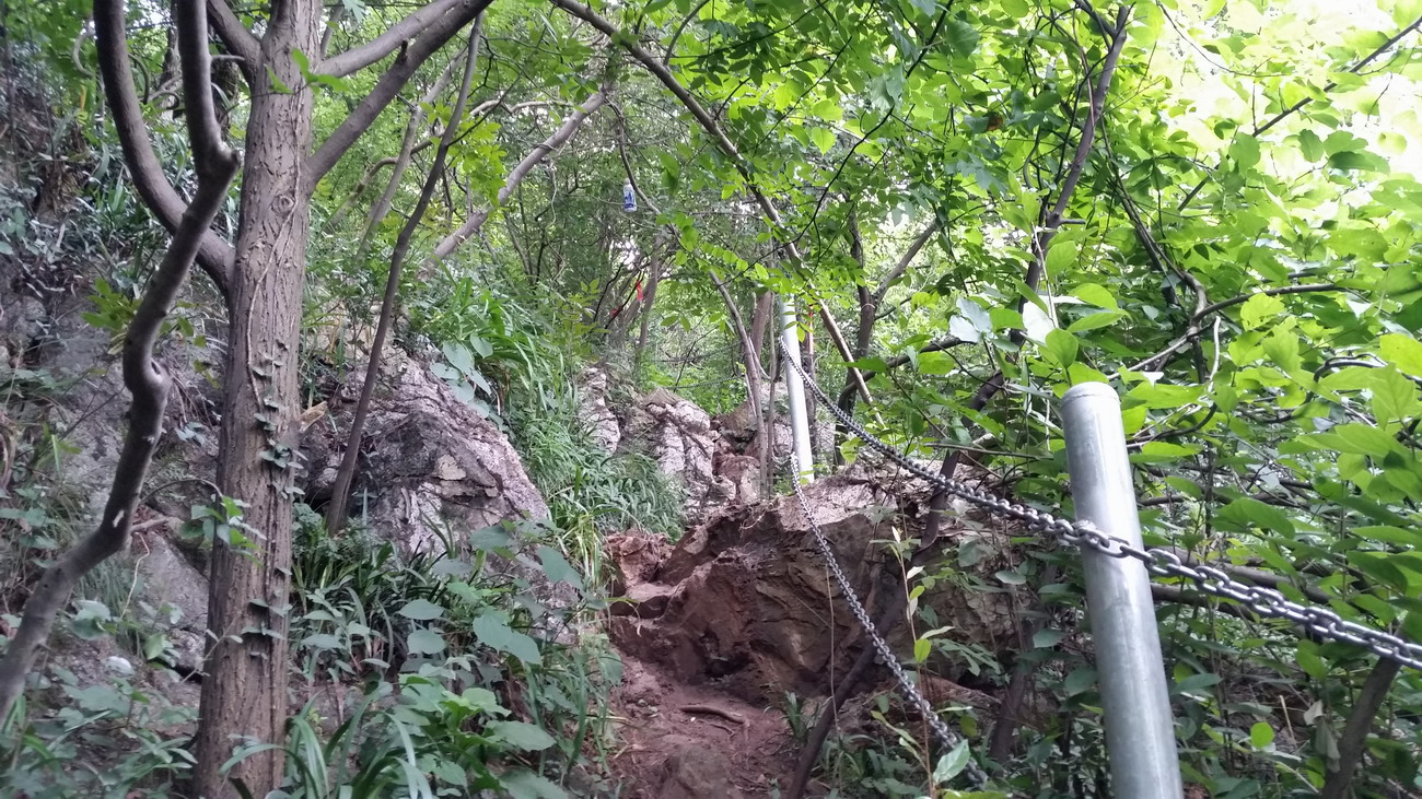 越过狮平线,走了一小段较为平坦小路,开始攀登鹰嘴山,鹰嘴山不算太高,但登山山路较陡,不甚好走,为防止徒步登山者滑倒受伤,或摔至山下,有二处路段拉设了保护性铁索。只要徒步者小心,一般不会出现意外性情况,爬过第二处保护性铁索之后,12:49到达植被极其茂密葱茏的鹰嘴山顶。