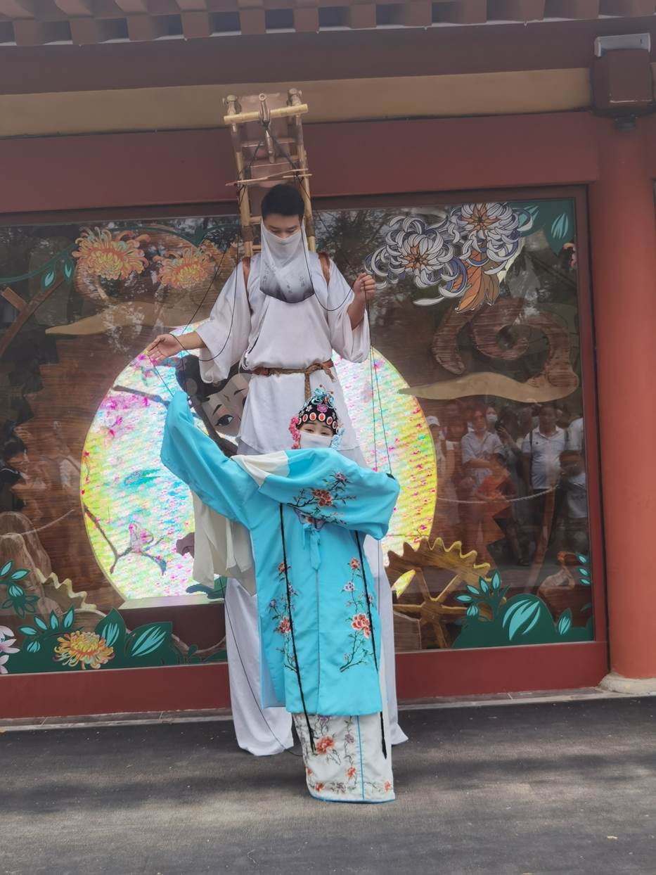 看了一次真人版的提线木偶。挺有意思。大概就是说后面那个男生踩高跷,拉着木偶线来控制前面这个女生跳舞。除了看现场的提线木偶,还可以去博物馆里面看一看,里面用的都是木偶元素,表达的是宋代文化和生活。