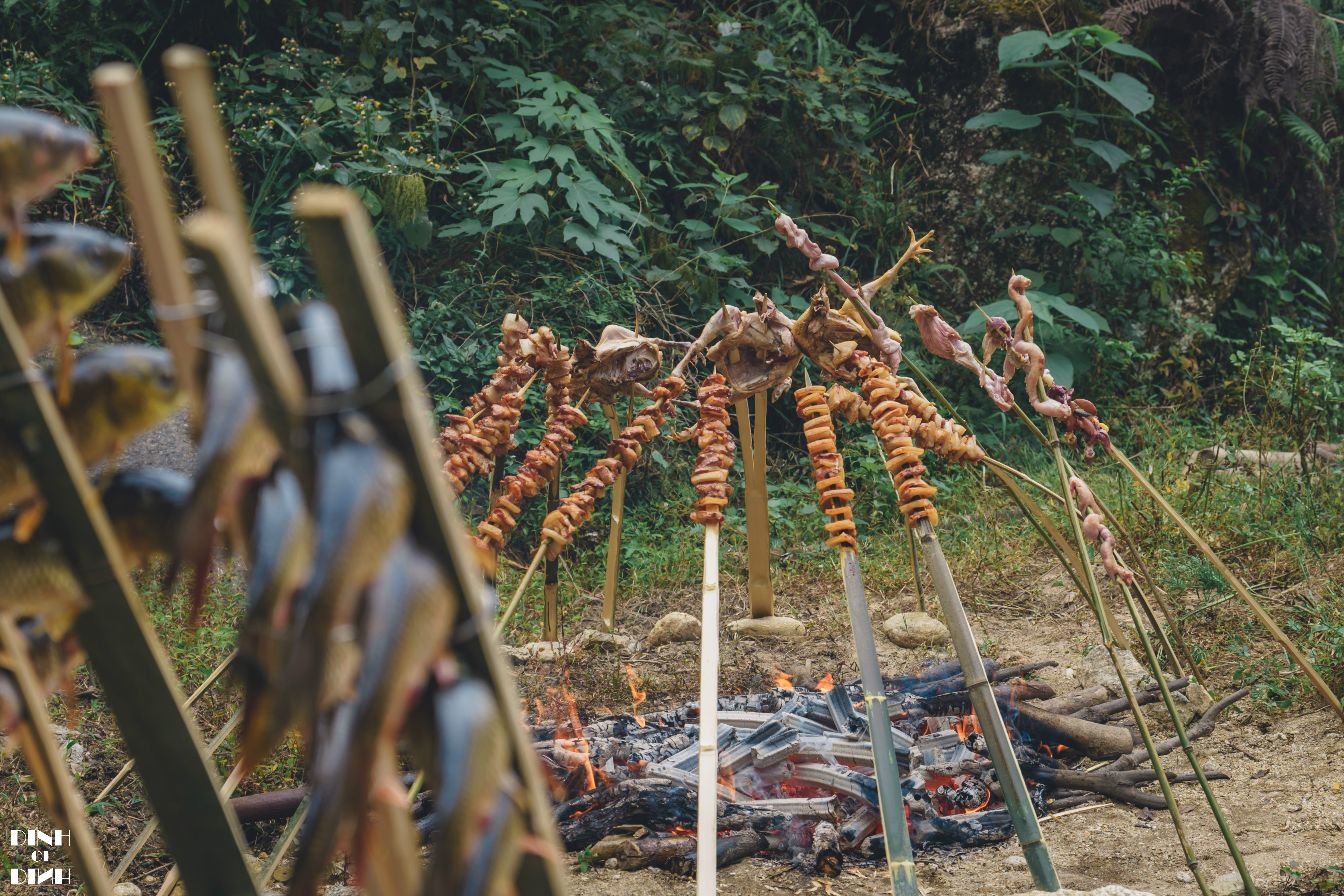 烧鱼是 融水 苗族同胞的习俗,前面看梯田的时候很多收割了的田里有水,这些水田里就养着鱼,烧鱼则是庆祝丰收的重要方式之一。每年的秋收稻黄时节,也是田鲤肥壮之时。这时候就是烧鱼的最好时候了。点一堆篝火,用竹竿把鱼夹着,就在田野间烧鱼野餐,尽享丰收喜悦。苗家的烧鱼活动从9月稻黄收割开始,持续到12月底才正式结束。