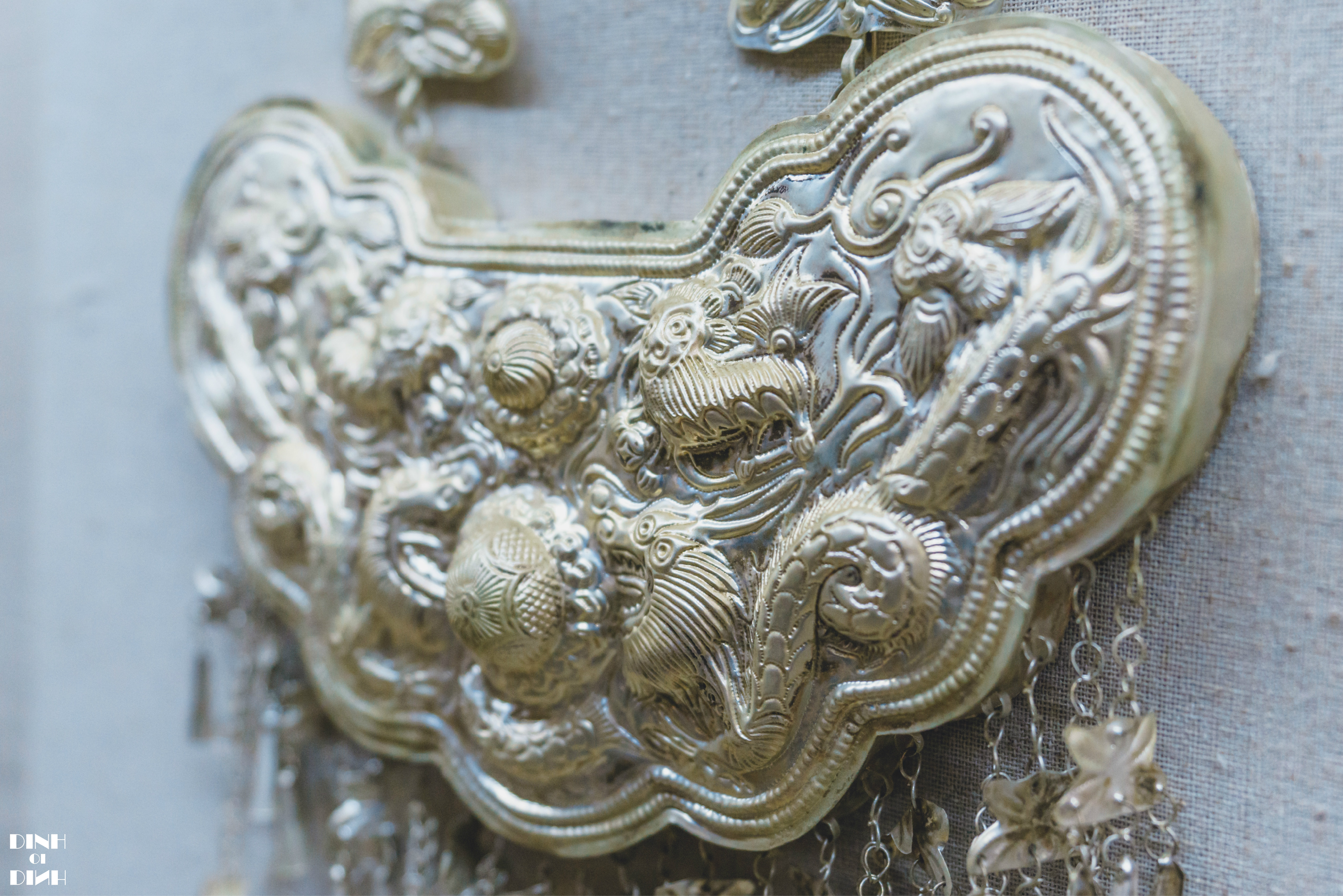 胸饰包括银项圈、压领等,银项圈的制作特别考究,上面的很多花纹和图样都来自于日常生活。如意和蝴蝶是常见的款式。其他装饰的图案多为龙、鱼、锦鸡、宝剑等花样,每个花样都有特殊的吉祥的寓意。