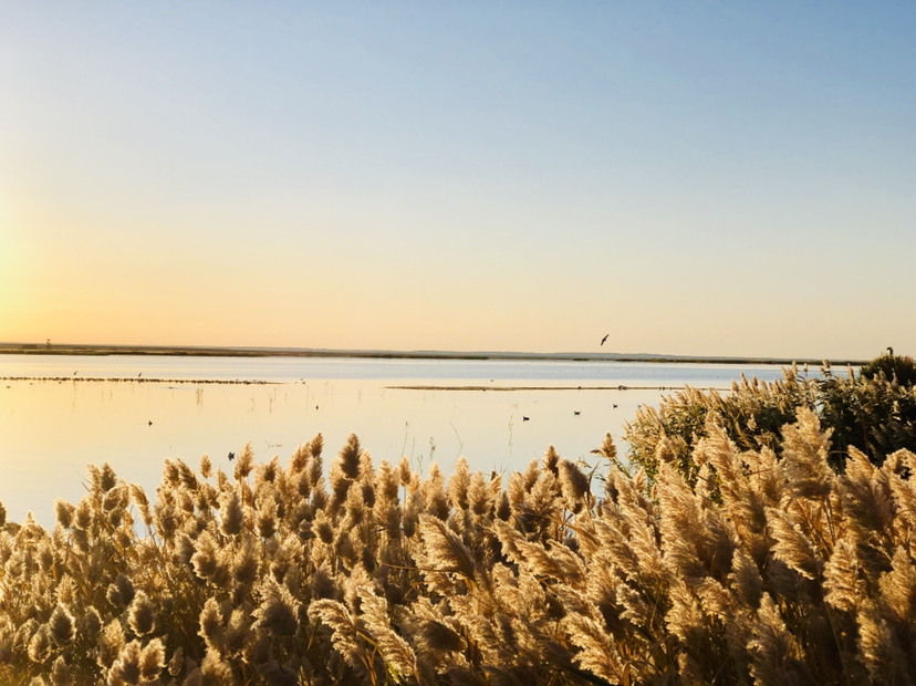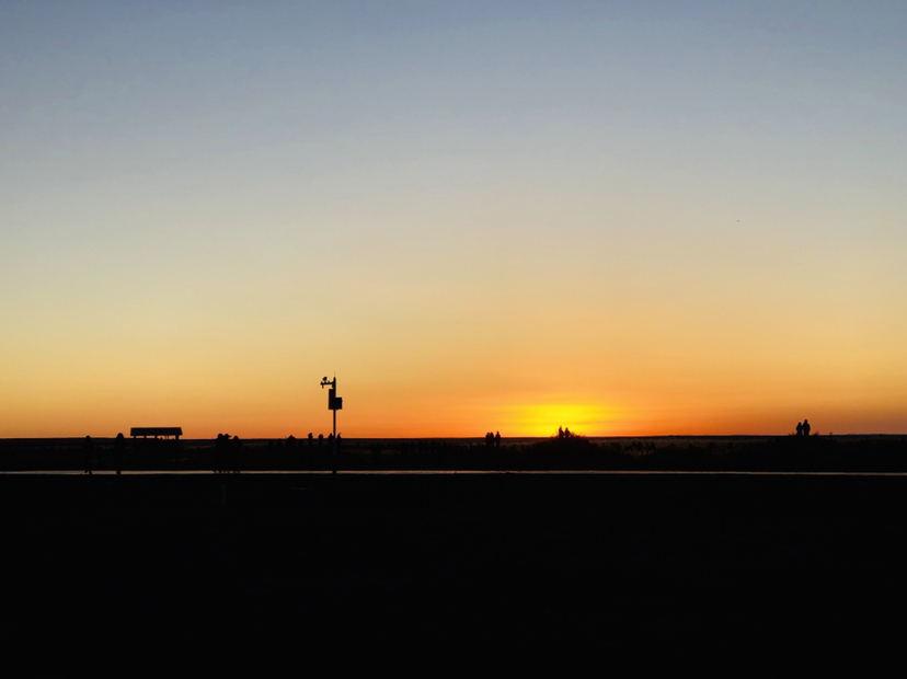 到达停车场 已经7点了 赶紧把车停好 飞奔去售票口买票 然后排队入检票口 看着天越来愈亮 我和L先生都后悔没早起半小时 好不容易检票进去 已经等不及坐景区车运去码头观景台 就跟L先生达成默契 拔腿就跑 以百米冲刺的劲直直往码头冲 结果也就冲了100米 我就没气了 跑的过程中看见沿途各个“山头”(也就是小土堆)都挤满了人 也本想挤上一个山头等待 但是又不甘心 因为早前做了攻略说 一定要去到海边芦苇边拍的日出才是最美的 所以又给自己加了加油 迈腿往前冲