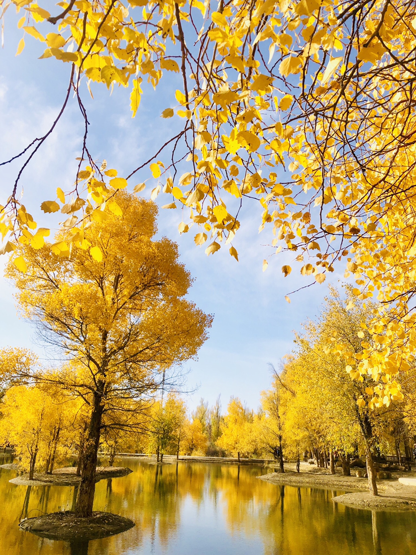 也不记得什么时候 在哪儿 见过那么一个画面 那倔强的身影 站在沙地 苍老的树干证明着他看尽这世间沧桑 金黄的叶子倒影在水面又展现着他的万种风情 怎能用一个美字来形容