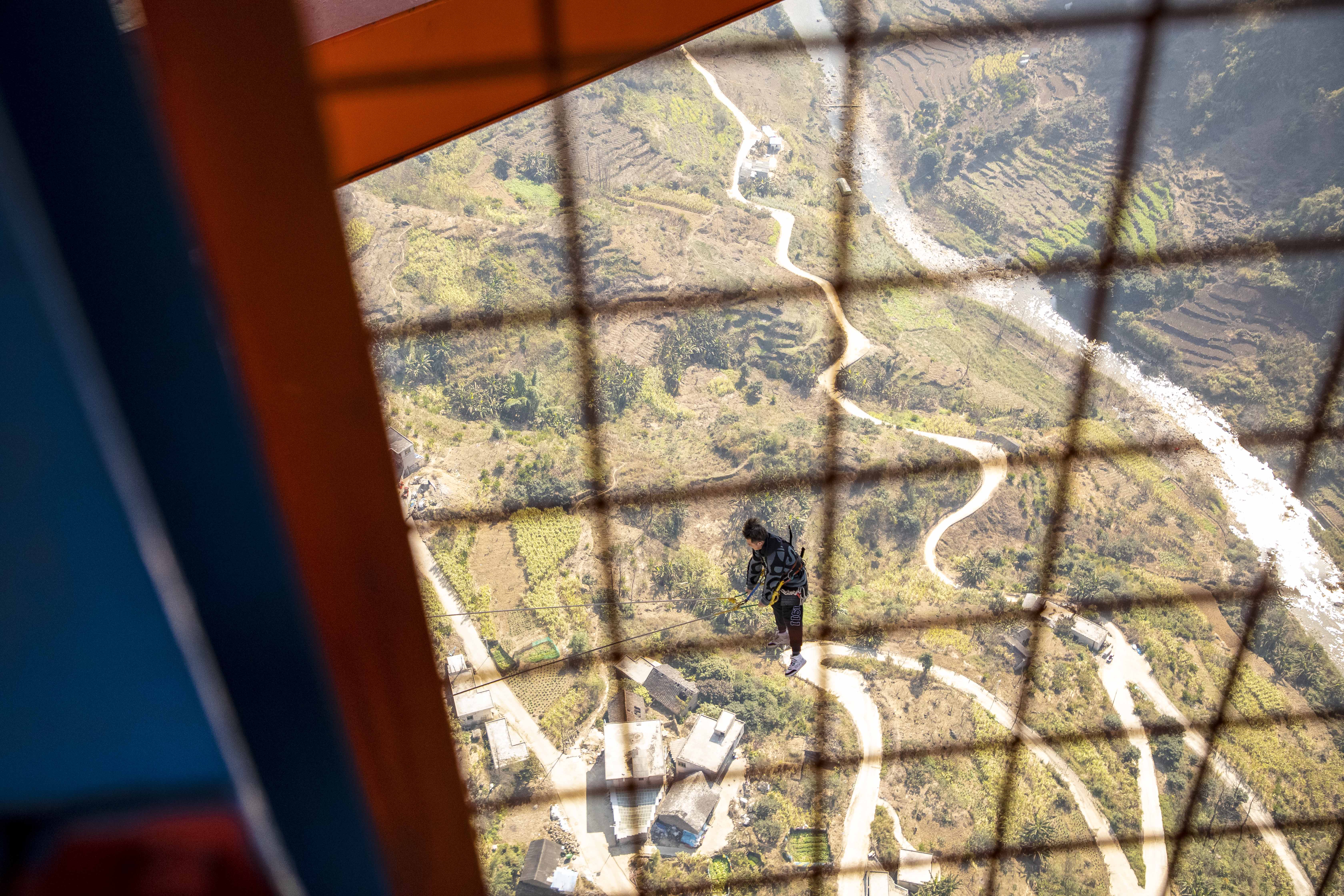 当这个小伙子穿好装备,走向跳跃台的那一刻,现场所有人都屏住了呼吸,荡绳像一个巨大的钟摆,把这个小伙子甩来甩去。在空中荡了几个回合之后,终于停了下来,整此情此景,让现场沸腾起来,阵阵尖叫声响彻山谷。