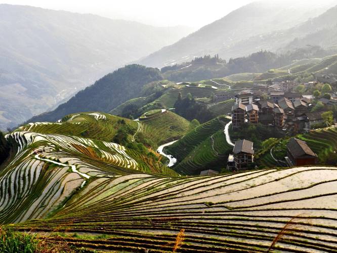 龙脊梯田其实是包含了好几个梯田的,我们先去的是古壮寨梯田观景区。这里的梯田也已经放水了,远处看过去就好像是一面一面的镜子。但实际上,这里也只是放了一部分水。