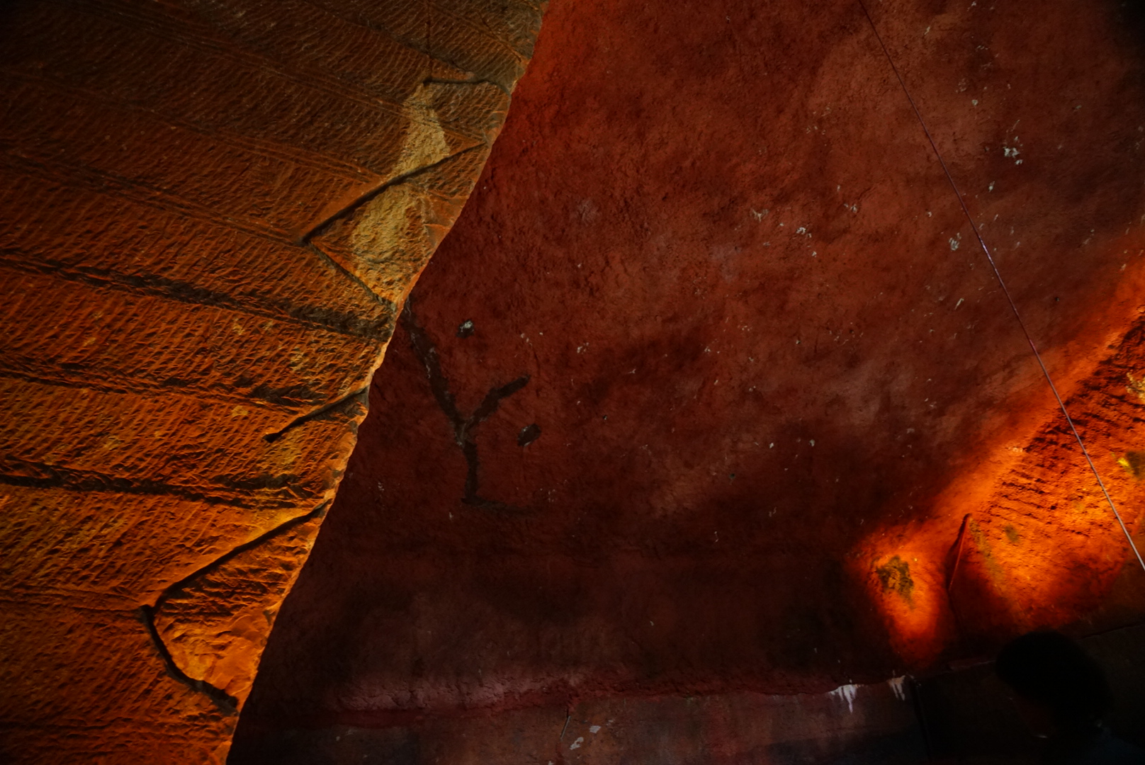 每个洞窟从矩形洞口开始垂直向下延伸,高度约30米。顶部呈漏斗型,洞窟内科学地分布着3-4根巨大的“鱼尾形”石柱,与洞顶浑然一体。更让人叹为观止的是洞壁、洞顶和石柱上都均匀地留下古人似乎带有装饰意图的凿痕,一共参观了5个石窟。