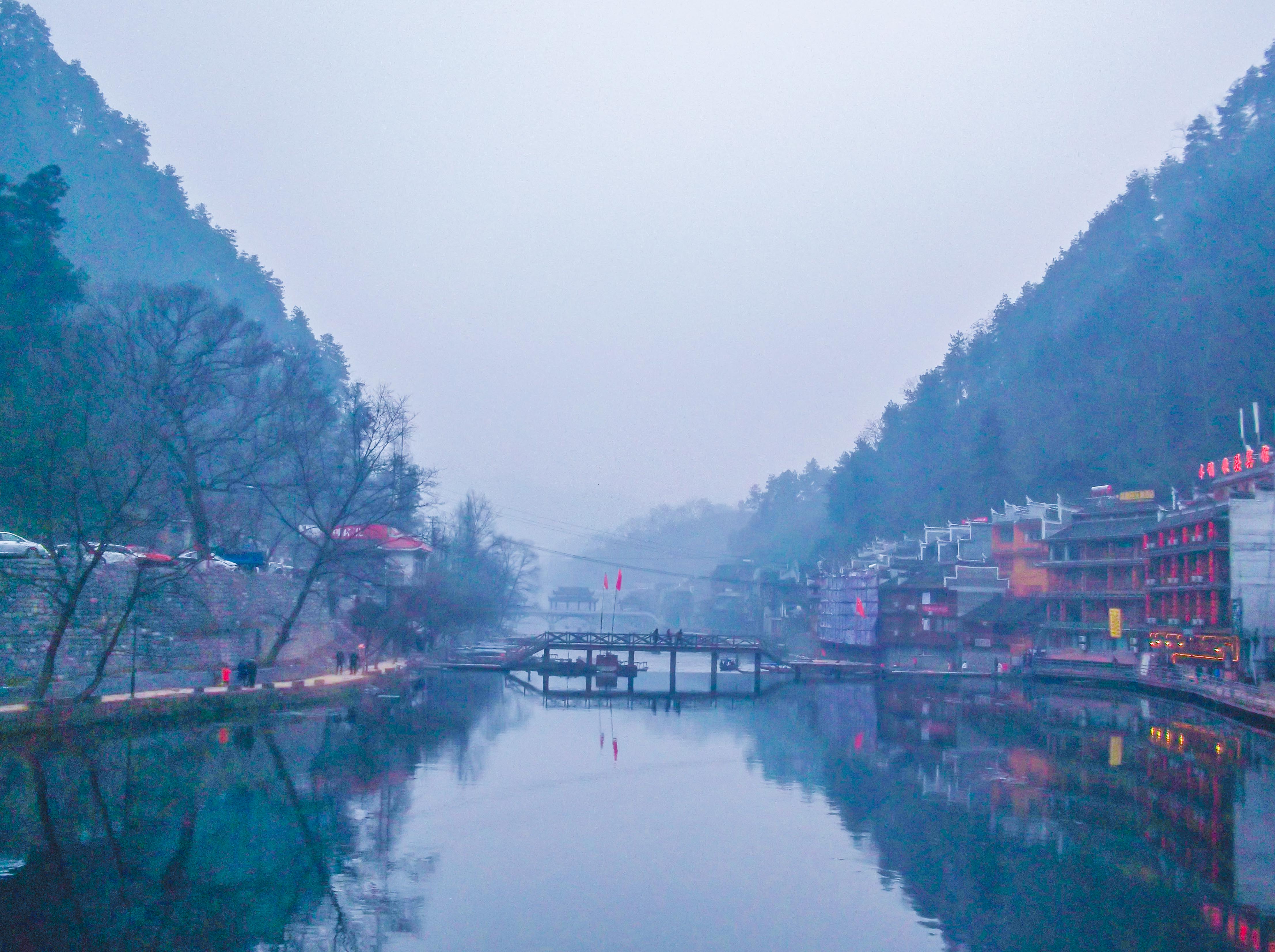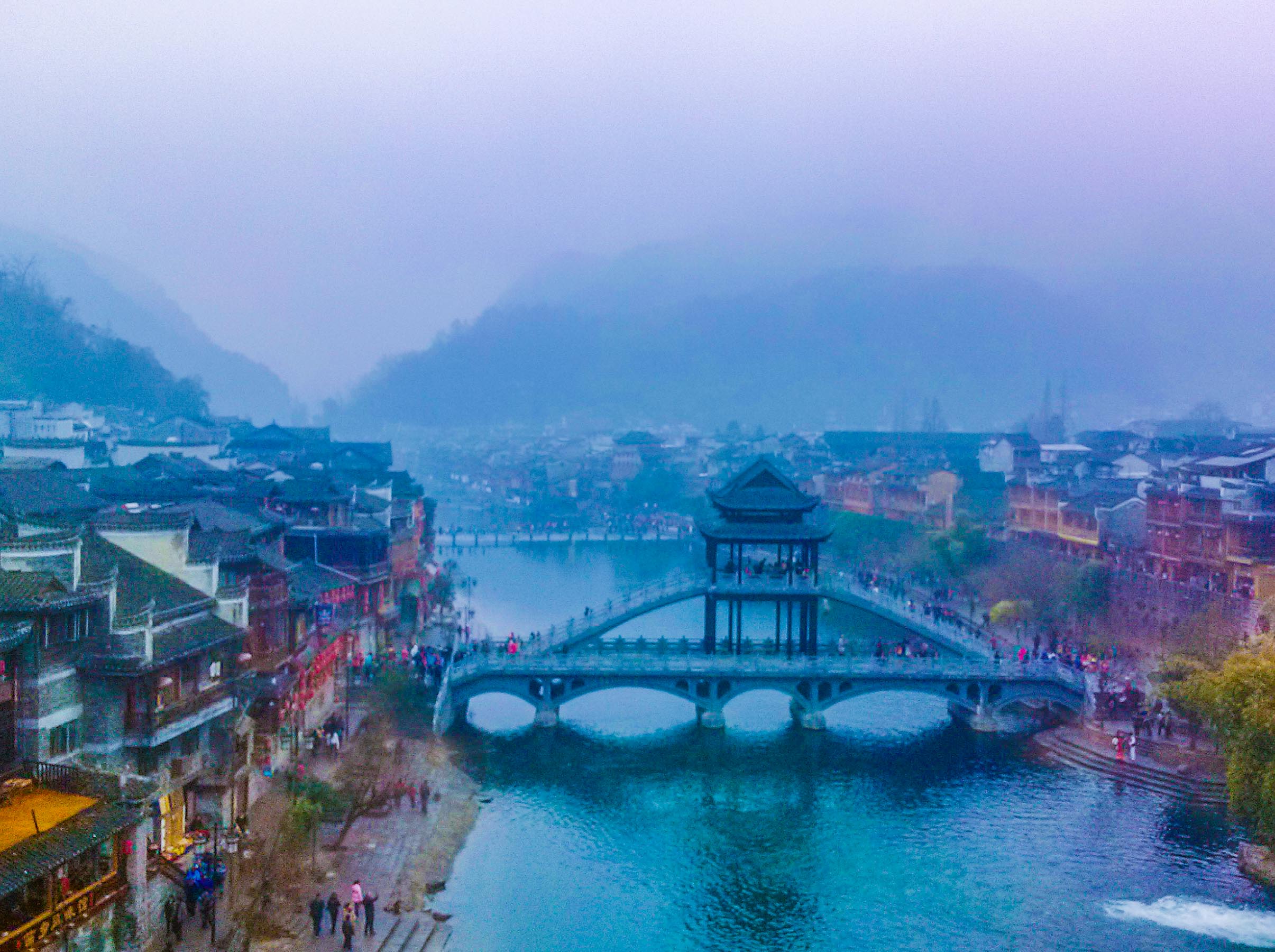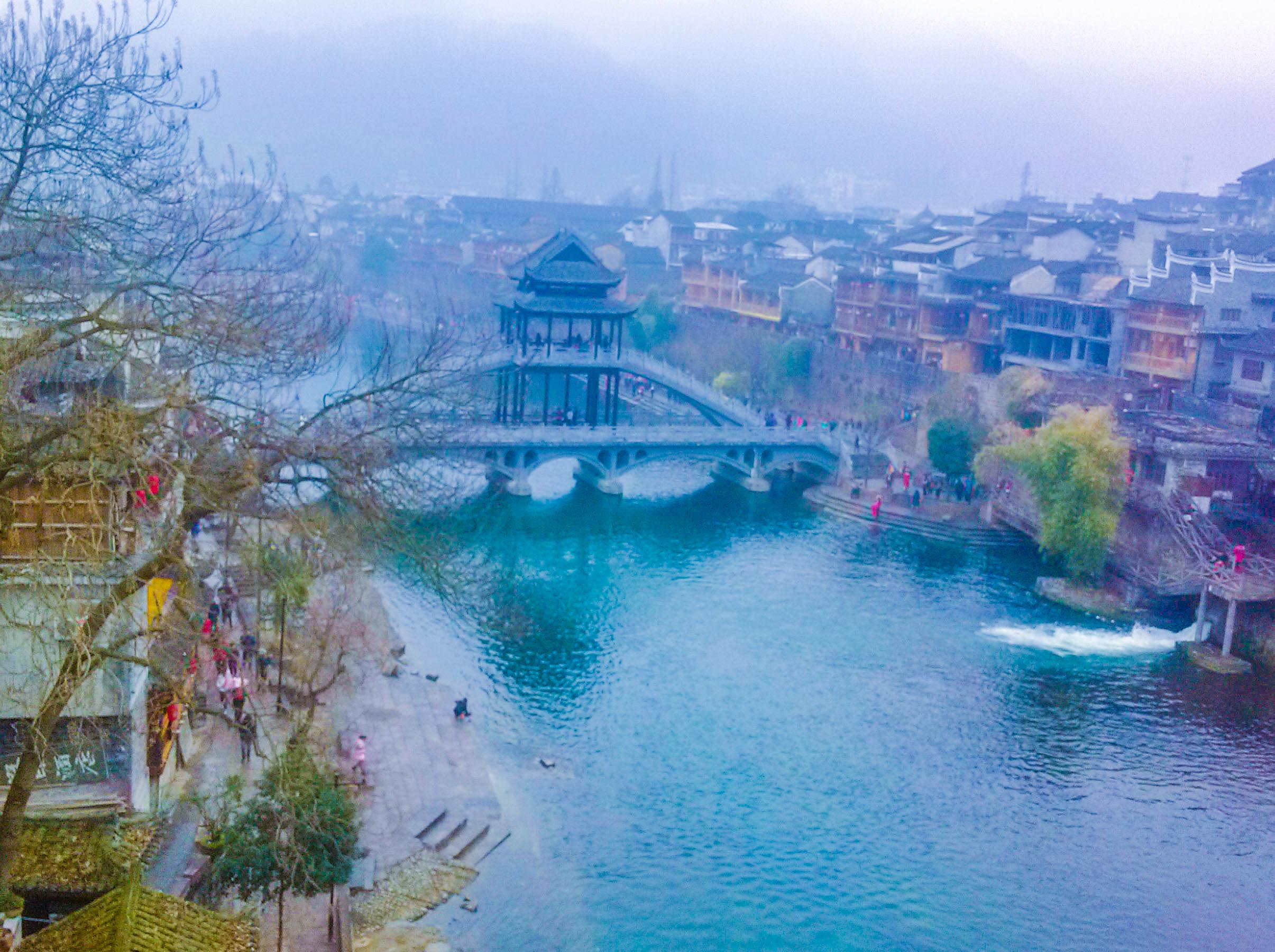 冬季的凤凰古城也十分美丽。江水清澈,人群喧闹。漫步沱江畔,走走看看,吃一碗“艳遇臭豆腐”,看什么都新鲜有趣。