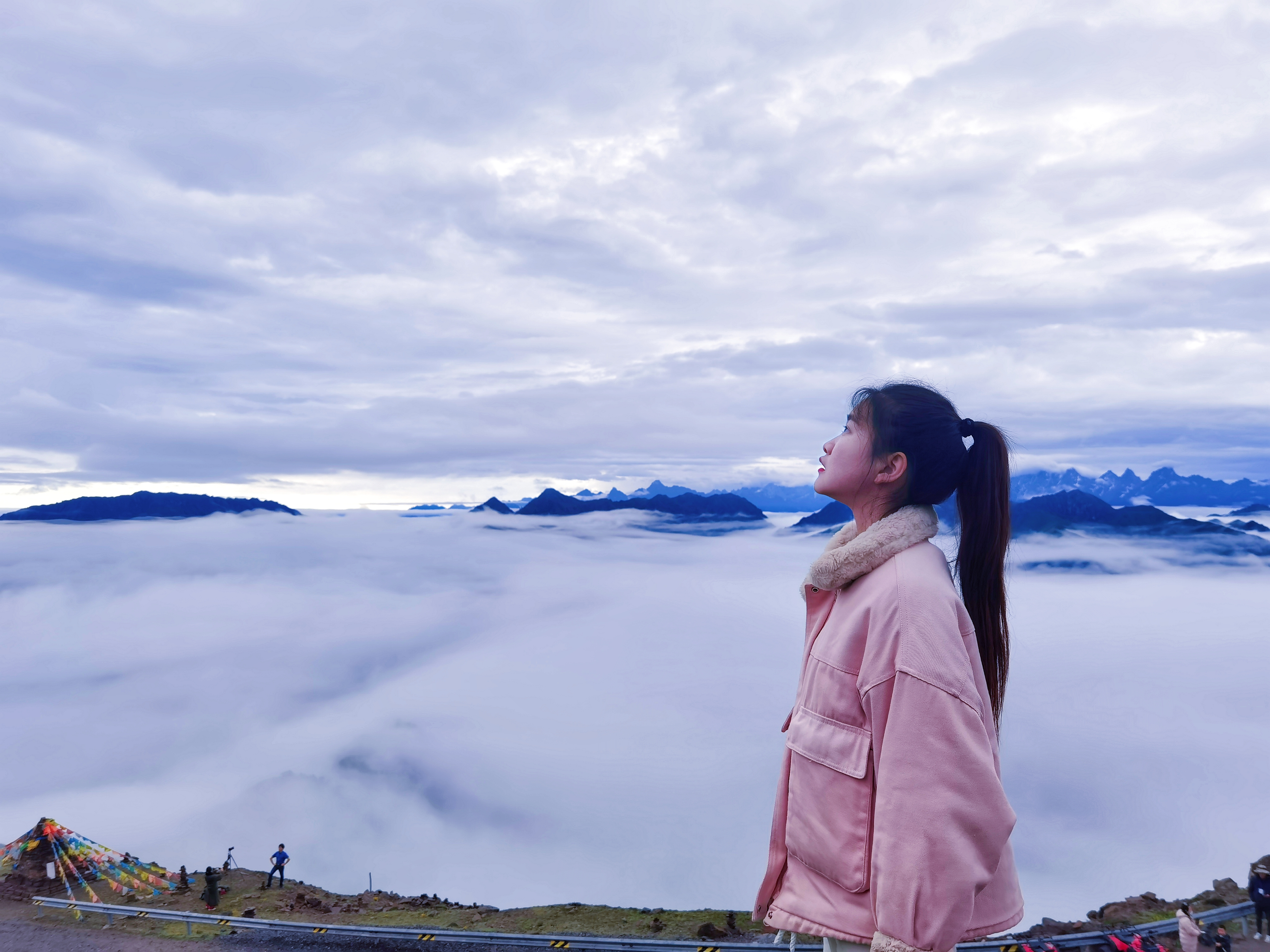 山巅草甸之上,仰望万里云海,达瓦更扎藏语意为美丽的神山,环顾北面的四姑娘山,南面的帕格拉神山,西面的贡嘎群峰,东面的峨眉山。虽然天气不是绝佳,但已经被这壮丽的山色烙印在心底。💙