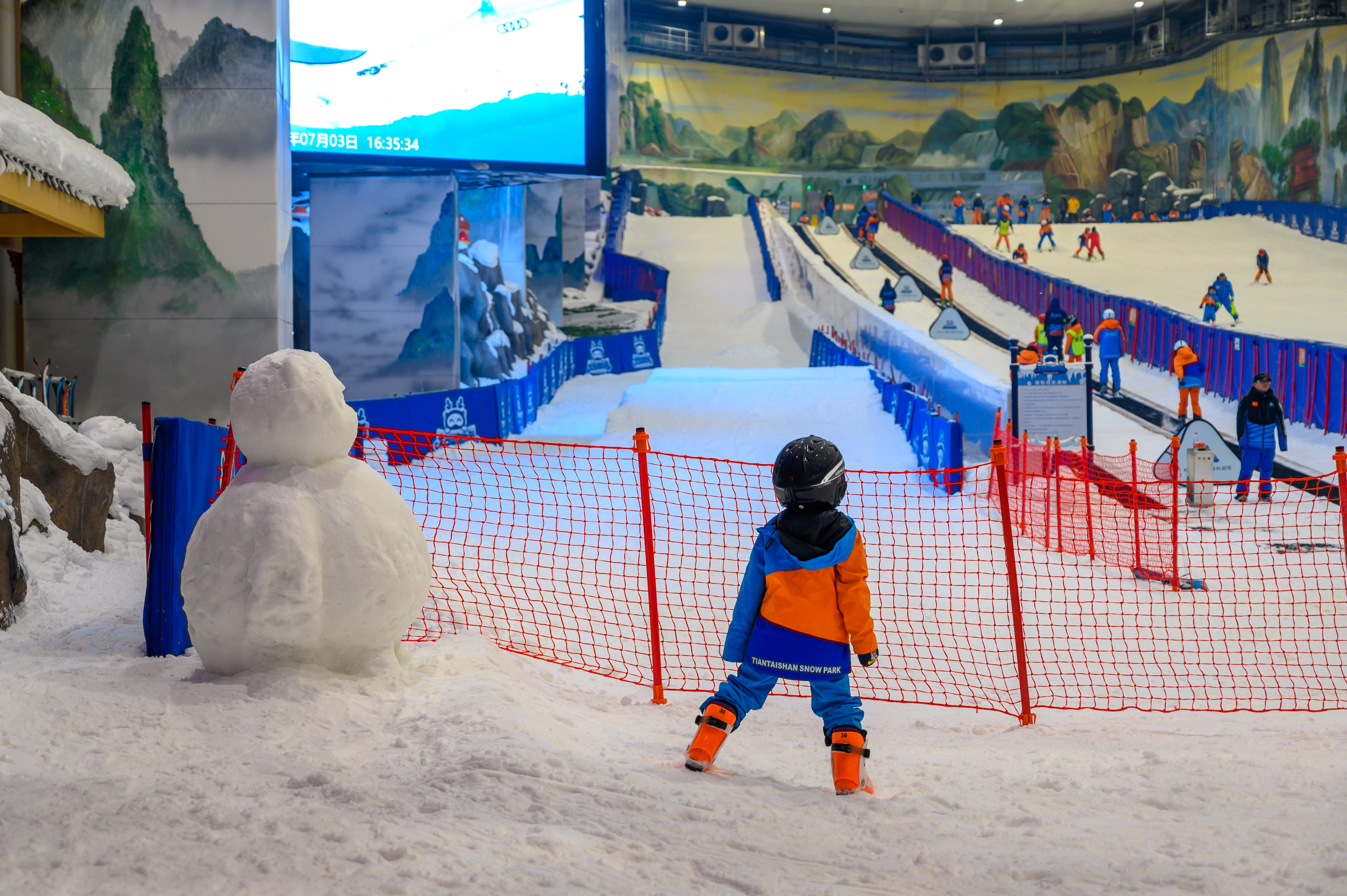 天台山雪乐园由暖区和冷区两大区域组成,其中暖区一层是售票租赁区域,滑雪服、滑雪板、滑雪靴等滑雪装备在这里领取,二层则是餐厅,滑雪是一项体力消耗比较大的运动,及时补充能量是非常有必要的,另外还有沉浸式VR滑雪体验馆、儿童手绘空间、冰雪科技空间等。