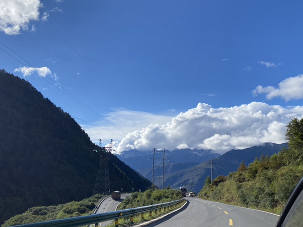 前一晚到成都,懒床起来后去吃火锅,12点再约定地点集合。由领队带我们一路往西,路过青城山都江堰到映秀后开始盘山。灰蓝色的冷冽江水滔滔,风景都被山间云雾遮挡,大家从兴奋到平静再百无聊赖合眼的休息,没想到当车驶出巴郎山隧道后,我们眼前出现的是个艳阳天,大团大团的白云仿佛触手可及,天空蓝的像电脑屏保,我们都兴奋不已狂拍照。
