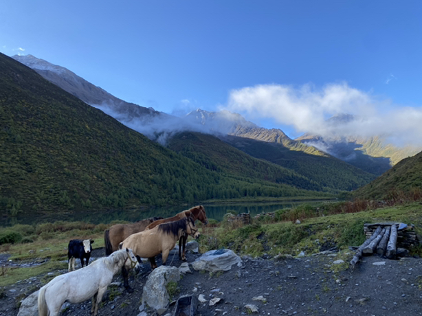这是几天徒步中最轻松的一天,大家谈天说地,欣赏美景认识野草野花,有老鹰盘旋在头顶,路过很多牛群羊群,打尖包还有10元一碗的泡面,可以续热水。三天团和五天团的线路由大江报补给点开始分叉,三天团继续上坡汪二峰大本营赶,而五天团午餐后由上升的缓坡转为山谷间的下坡缓坡,前往大海子营地。领队给我们在丛林间采野生菌,准备晚上给我们炖鸡汤喝。