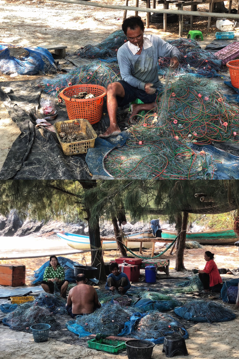 渔港就在不远处,下午的渔民并没有休息,修补渔网的,晒鱼干的,依然忙忙碌碌。我们举着手机照了一通,看看没什么海鲜可买也就撤退了。
