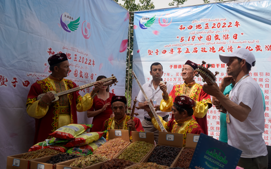 活动现场,还设置于田县非遗集市、美食体验区展柜和玫瑰花茶、玫瑰花酱、红枣等特色产品展销区展台,让游客在体验和欣赏于田特色文化的同时,真真切切感受到在园中游、在游中乐、在乐中感受到多角度文化和旅游的融合体。开幕式结束后,文旅产品直播带货、国家非物质文化遗产麦热球体育表演、于田小花帽现场制作展示、“小夜市”食神大赛还在火热进行中。