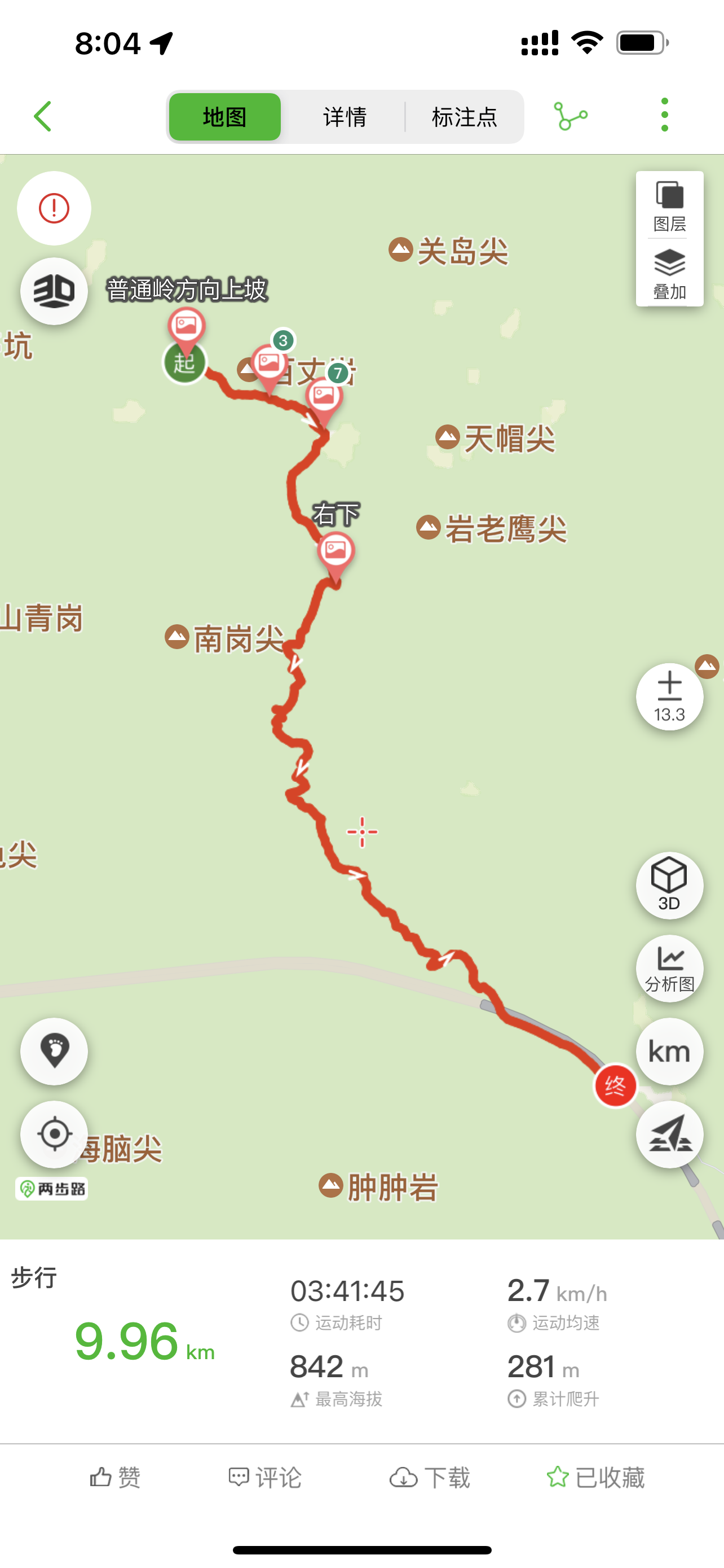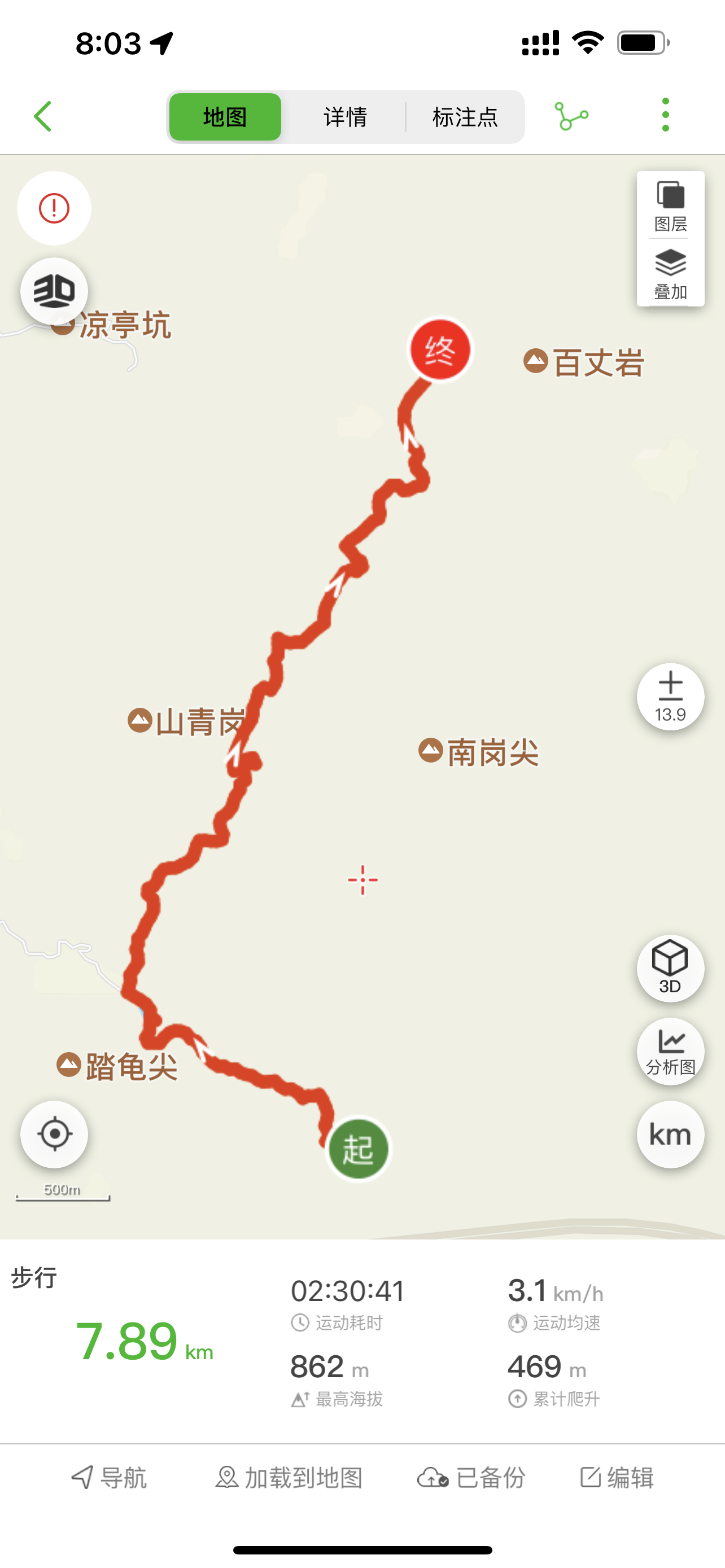 开始爬升一公里时,遇到了一个小状况,一位走在对尾的男生很吃力,大汗淋漓,犹豫不觉到底是继续坚持,还是放弃返航。在其女朋友的开导下,经过反复思考,最终决定放弃。我也很认同他们的决定,硬上的意义不大,即使完成了,体验也不好,大丈夫能屈能伸,何必逞一时之快呢。通过这次的艰难历程,想必他会对自己的体能有了更加精准的认识,其体验肯定是深邃的的,回家后加强锻炼,下次再战好了。