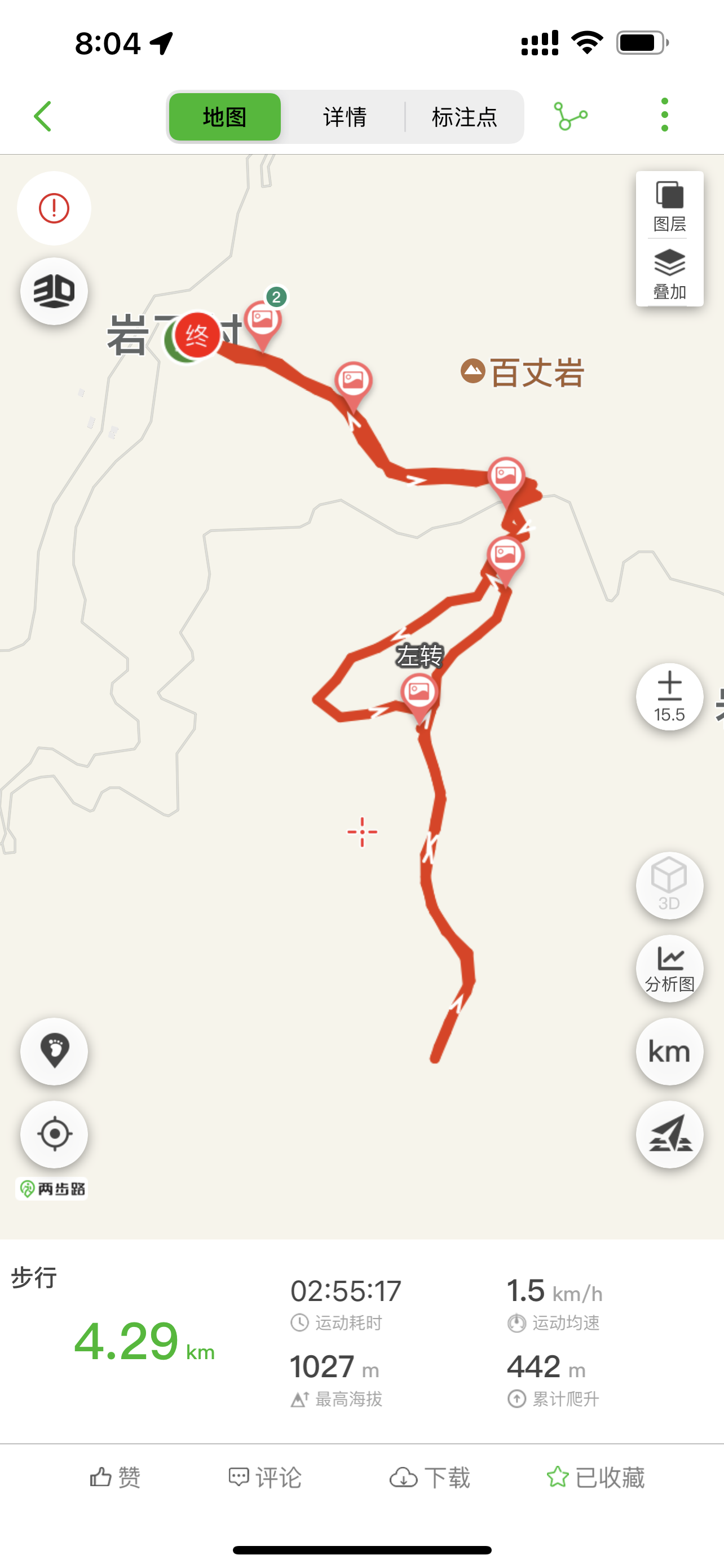 第二天观日出,全程4.3公里,从岩下石头村沿着普通岭古道到山顶再返回,累计爬升442米,最高海拔1027米,整个过程耗时3小时左右。