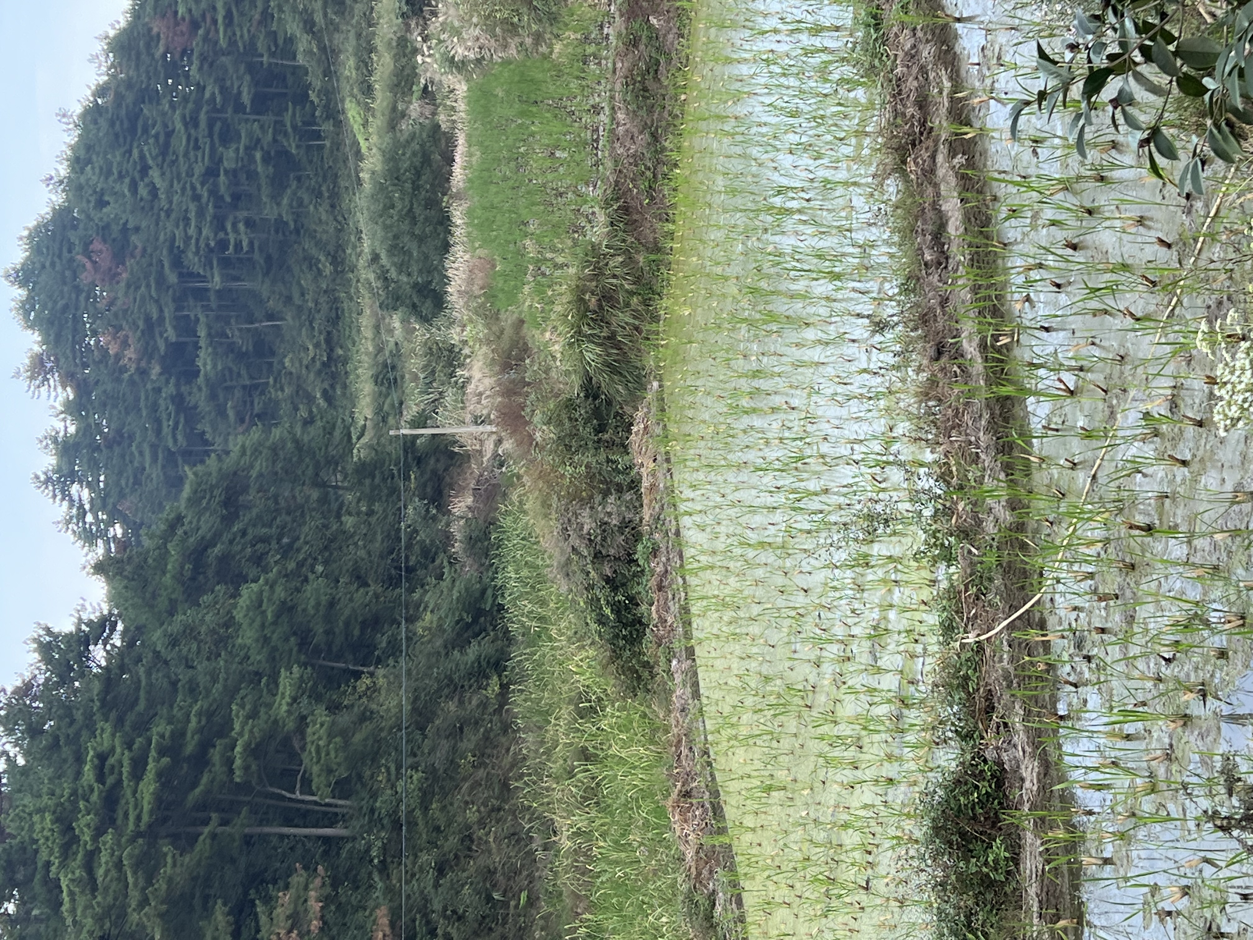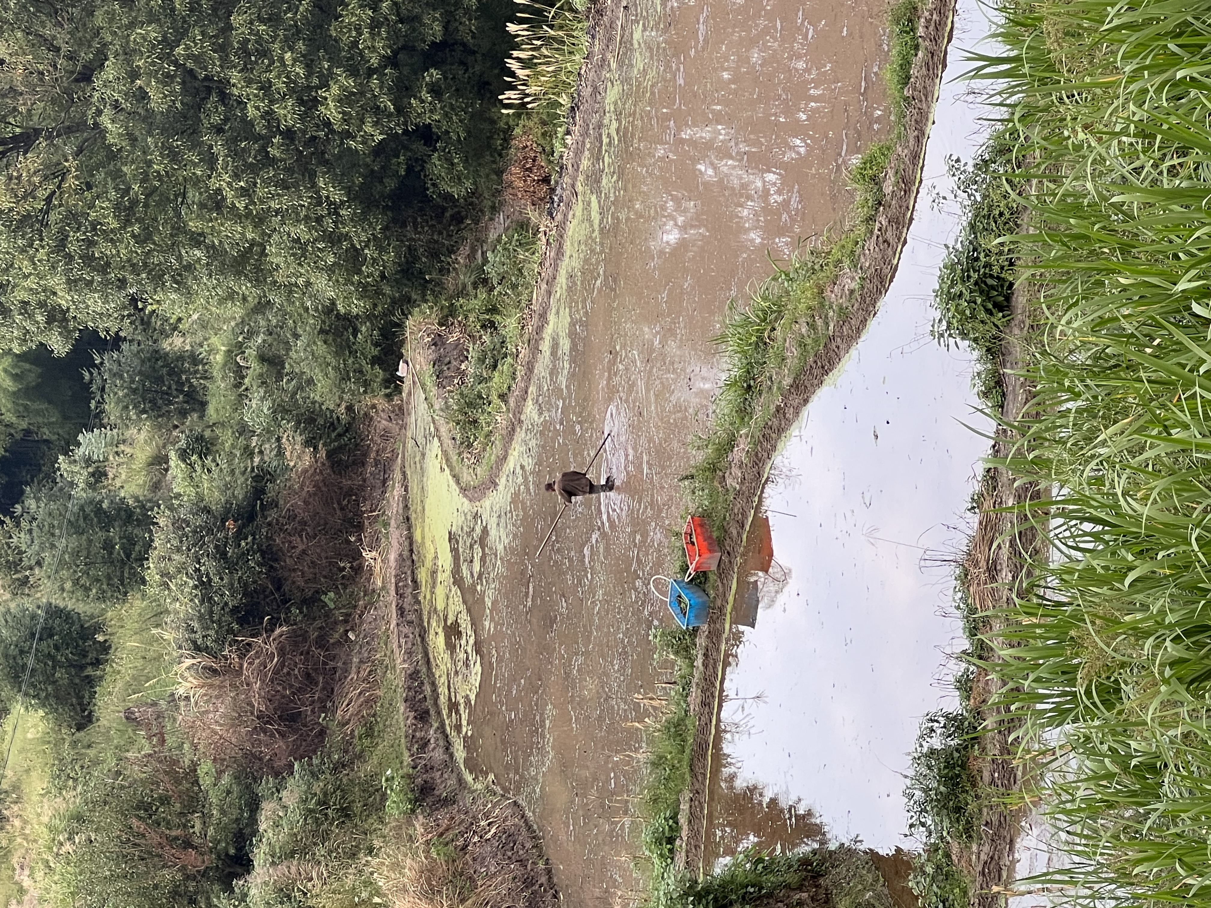 接下来的行程就比较容易了,从南田村开始的2公里比较平坦,大多是沿着公路前行,后面开始沿着小路下行,绕过了一段盘山公路,途径齐坑,映入眼帘的是刚插入田里不久的秧苗,然后再沿着公路直接下到终点岩下石头村。