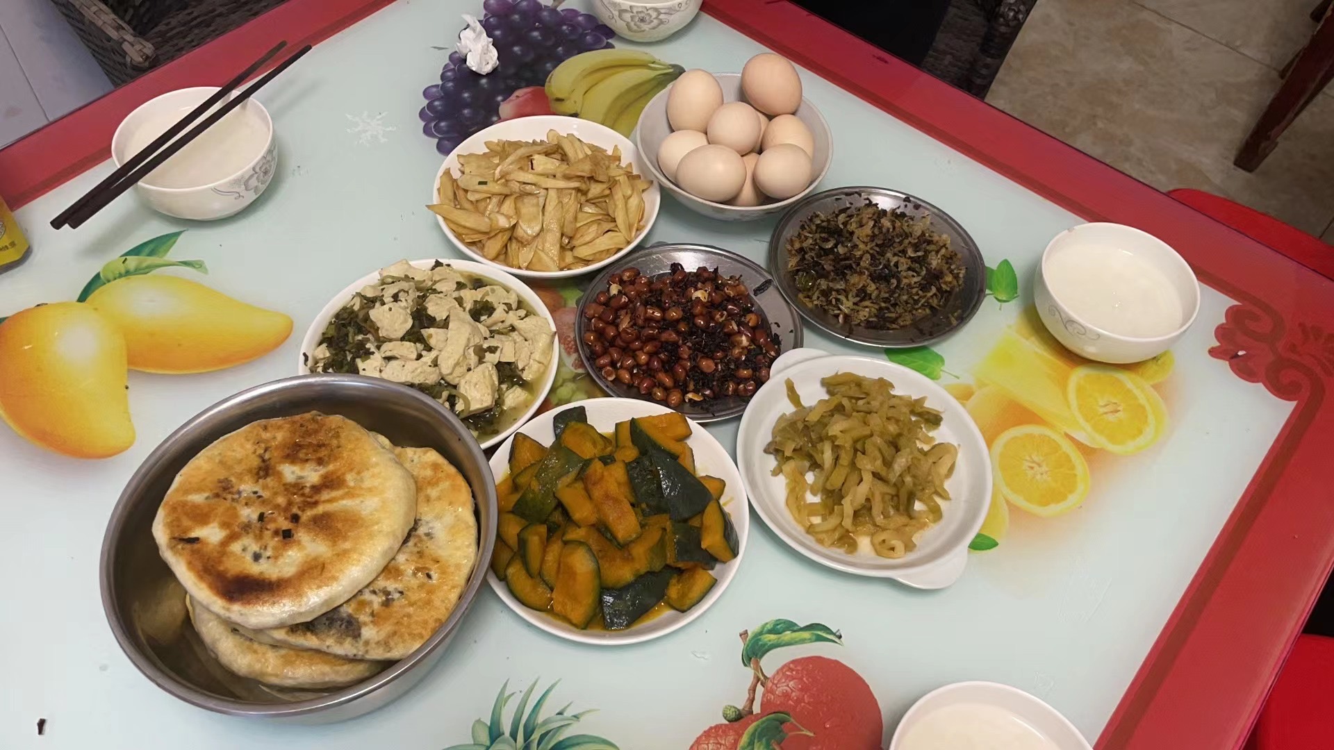 早饭在各自住宿的农家就餐,基本上就是面条或稀饭,再加上馒头和鸡蛋,这里最大的特色小菜是豆乳,几乎每家也都在摆在外面卖,放了个收款二维码就不管了,很是淳朴。