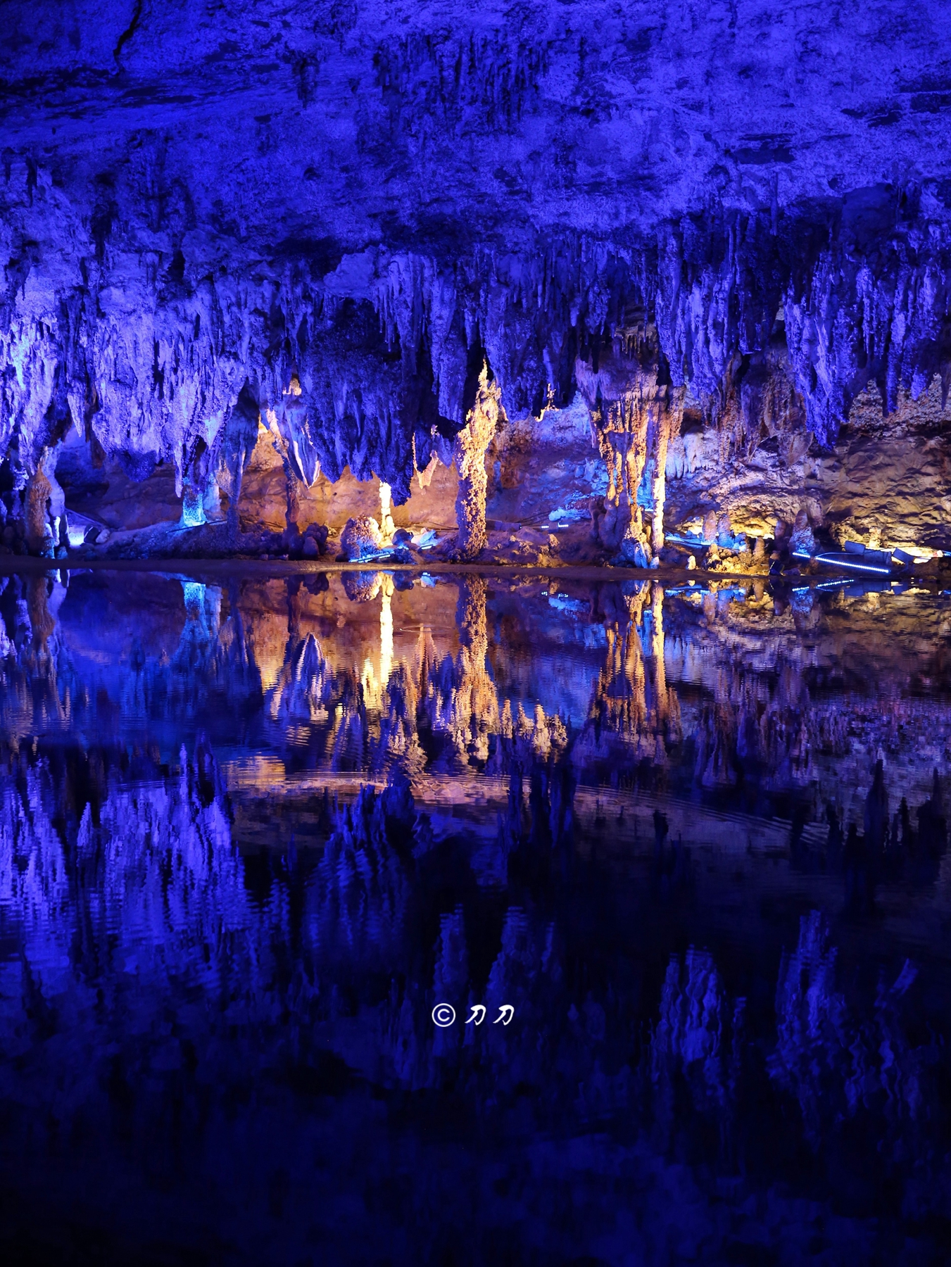 地下梯田如镜面的湖水,将溶洞景观完整复制,经过五颜六色的灯光点缀,倒影若隐若现,如梦似幻,宛如置身于“海市蜃楼”。