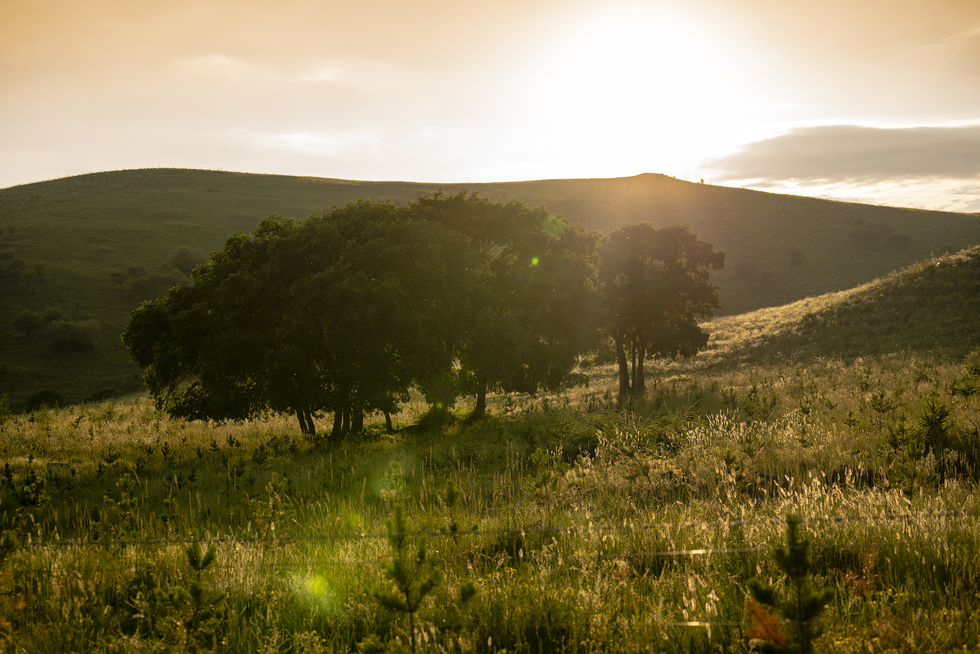 云中草原是一片稀树草原,草原和一丛丛的树林交织在一起,光线柔和,恍惚间,还以为是欧洲瑞士的风光。来柳树沟东山顶看日落的人不少,在山坡上一块平坦的大石头上,游人们在夕阳下留影。