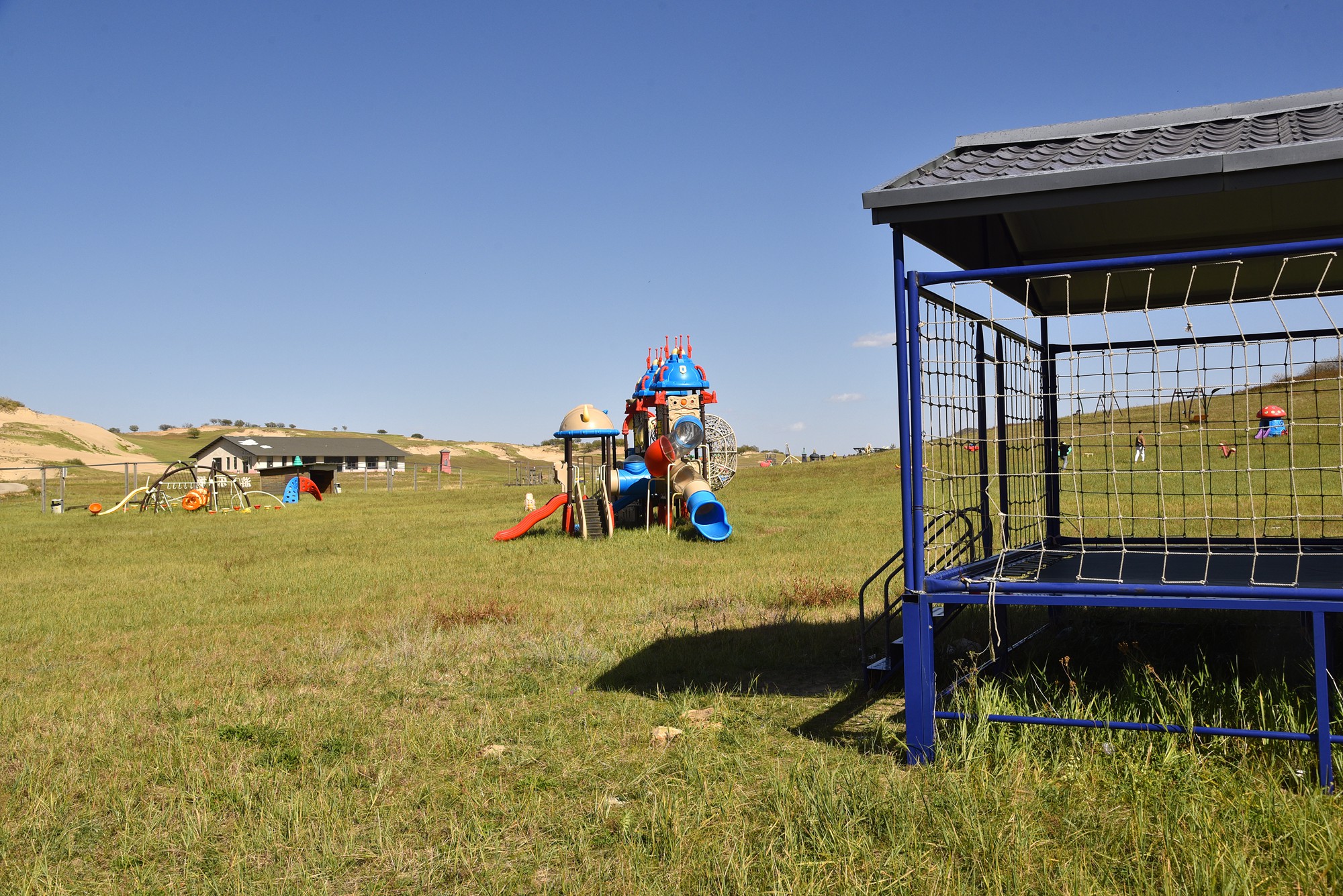 滑沙区是一片很大的游乐区域,不仅有滑沙,还有彩虹滑道、射箭、滑梯、蹦床、跷跷板等很多玩乐项目,我们挨个体验、拍照玩得不亦乐乎。彩虹滑道相比滑沙速度要快了很多,还有一段会腾空而起。射箭是考验技术含量的游戏,刚上手还找不到感觉,需要适应一段才有准头。