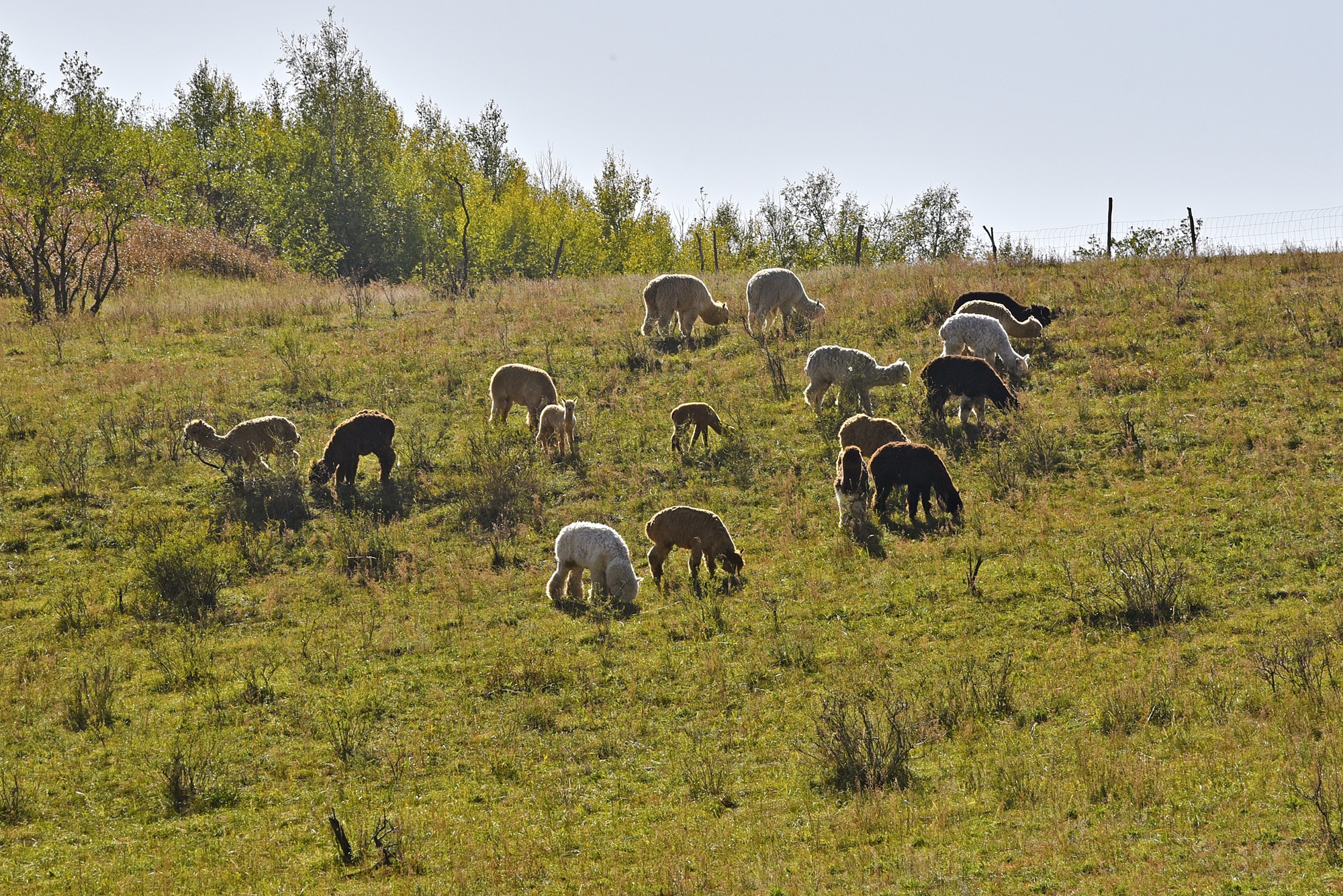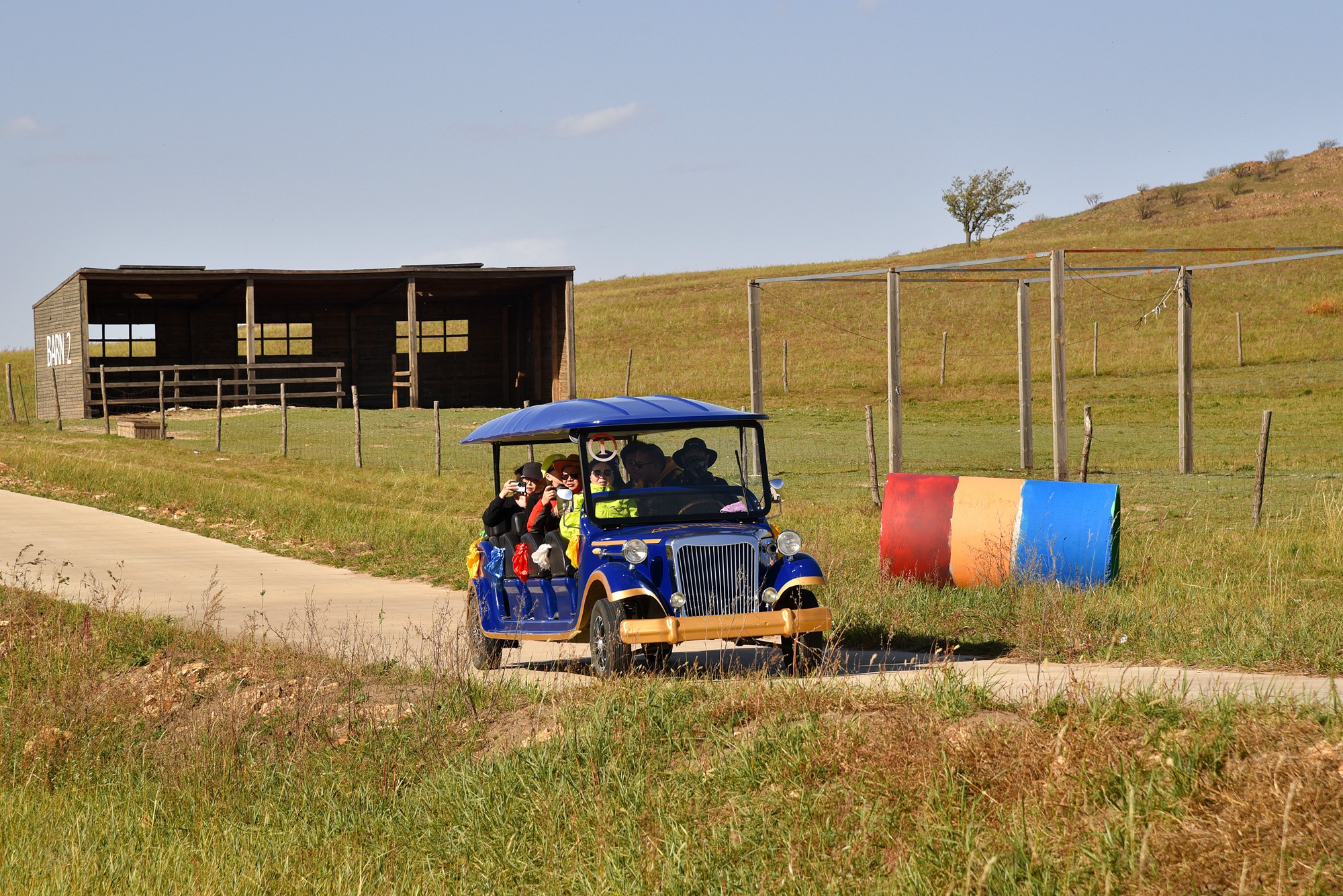 登上区间车走在辽阔的草原上,经过霍比特小木屋村庄,来到动物观光区。园区里饲养着羊驼、骆驼、牦牛、鹿等动物,可以近距离观看。羊驼在山坡上吃草,完全不顾及我们这些看客,只有走得很近的时候才会向后躲几步。牦牛则警觉得多,人进牛退,始终与我们保持几十米的距离。