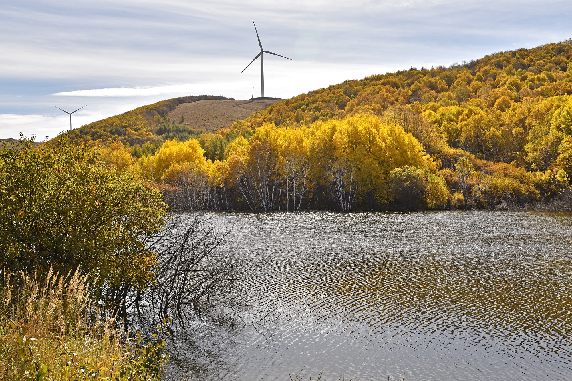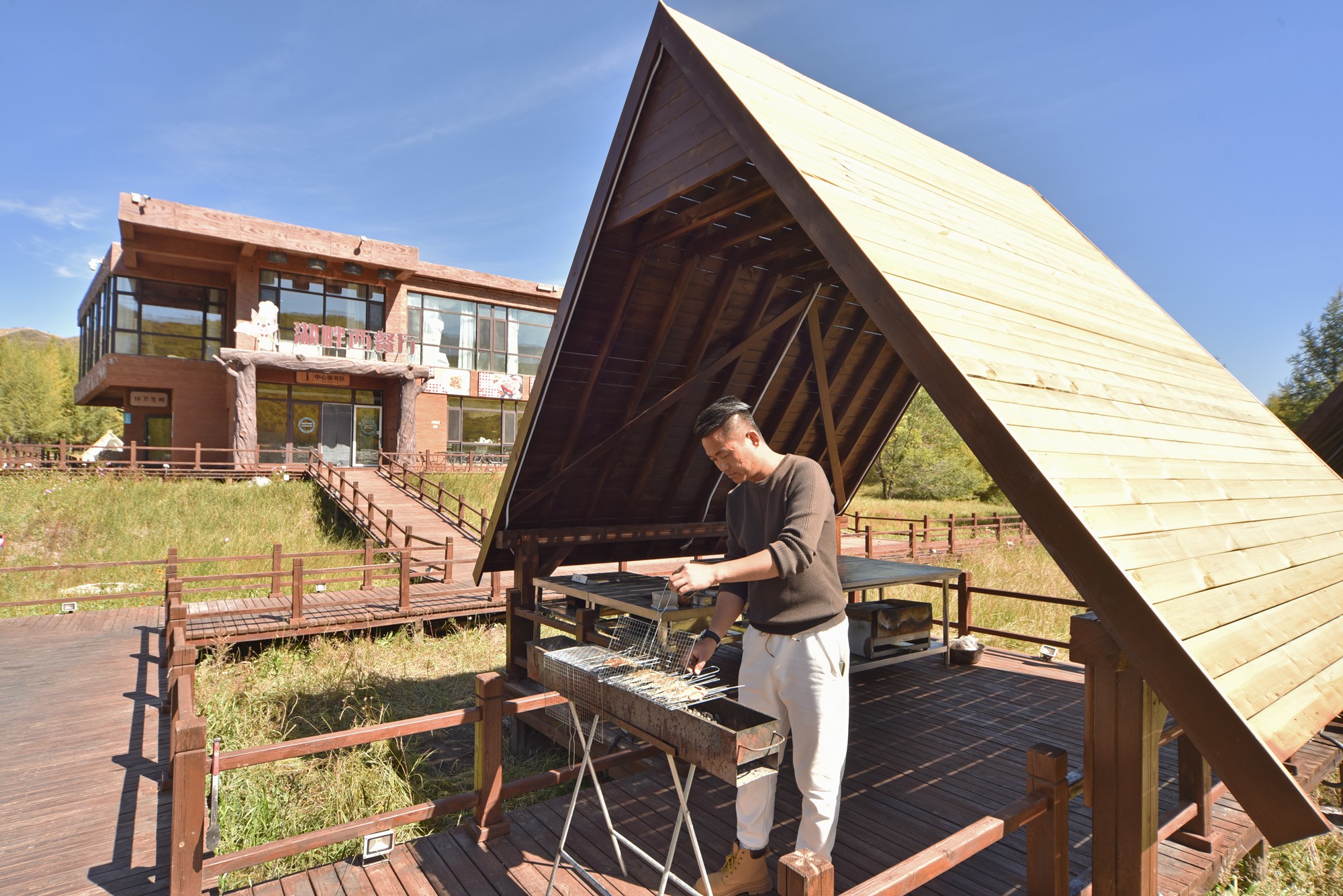 小火车到站了,我们走过廊桥,沿着湖边继续徒步游览,行走在风景画廊。白桦林的金黄是这个季节的主打色,落叶松则刚刚开始由绿变黄,呈现不同程度的过度色彩。