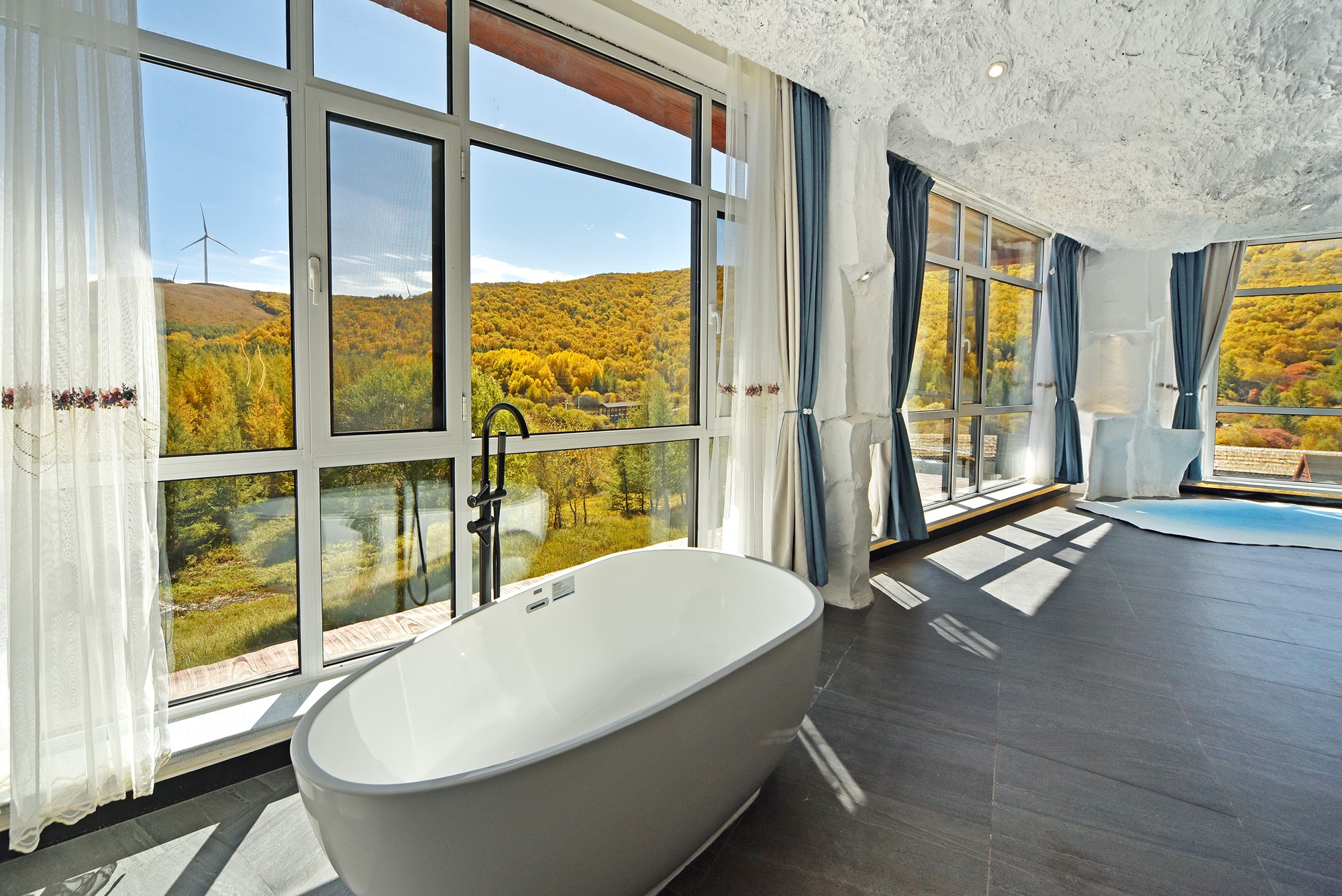 在景区内的中心服务区,开发了几间别具风格的七彩丹霞轻奢美宿,有冰洞、岩洞、溶洞,还有松鼠的家等不同风格。除了舒适的床,惬意的吊椅,还有能躺着看天镜湖风景的浴缸,既新鲜又安逸。