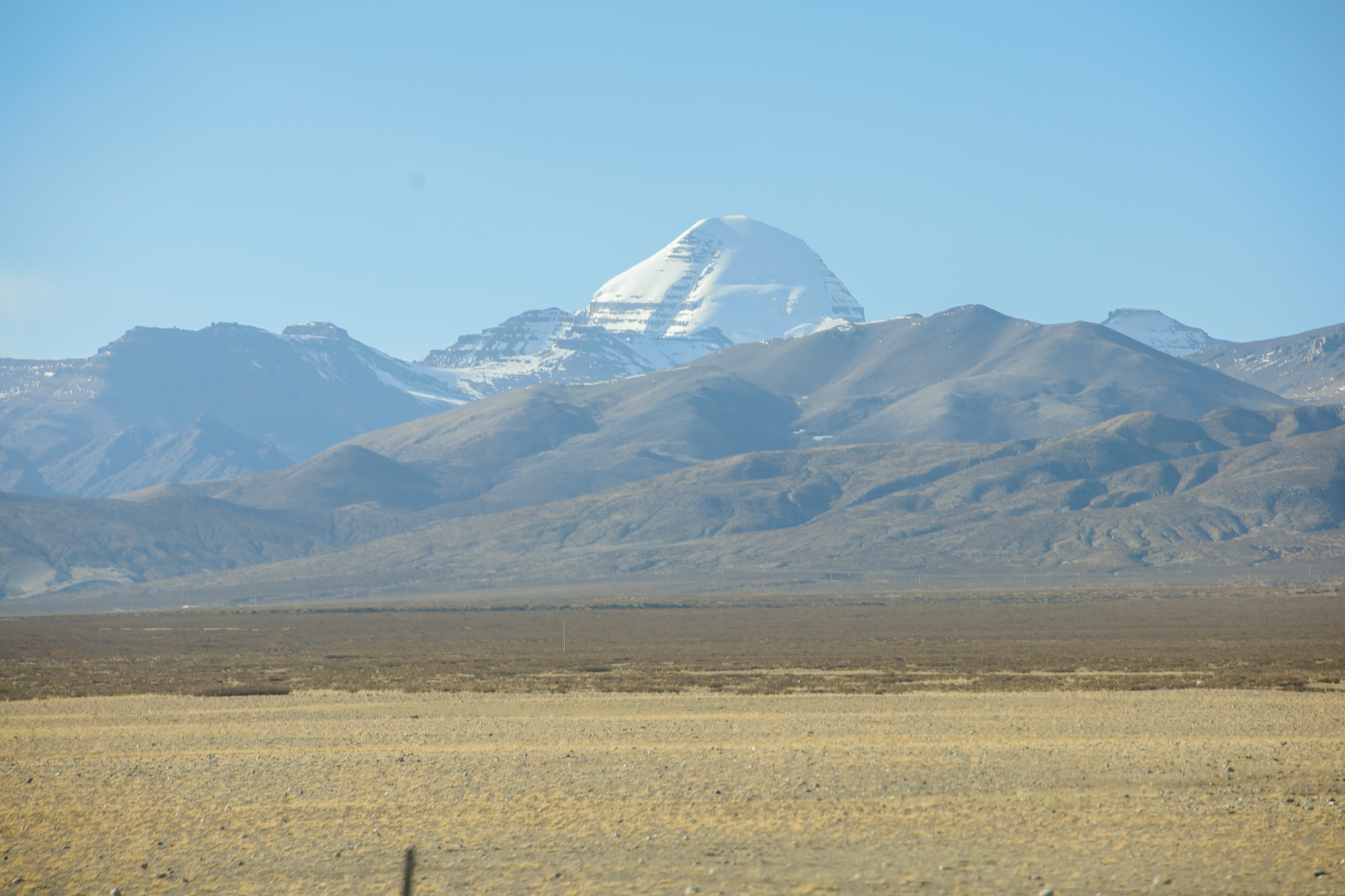 拍够了无名海子之后,我们继续向前,终于在下午的时候我们看到了那独特的、充满神秘的圆弧!那一刻我们不顾车上的抖动,把快门开到最快开始朝远方拍摄。由南面望去可见到它著名的标志:由峰顶垂直而下的巨大冰槽与一横向岩层构成的佛教万字格。