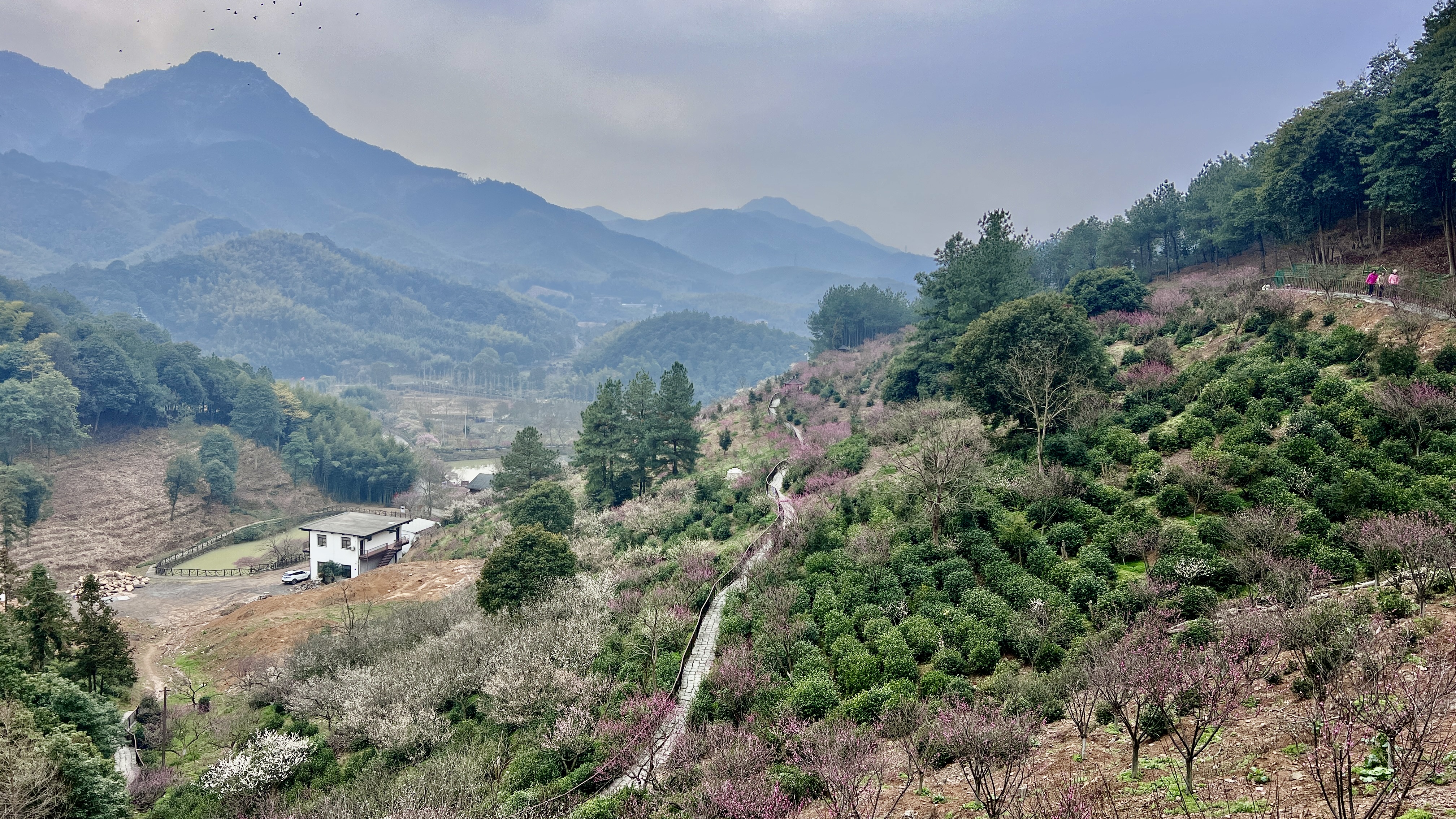 “春山茂,春日明。园中鸟,多嘉声。梅始发,柳始青。”(鲍照《春日行》)可在吉山梅园,春山疏,春日晦,鸟鸣稀,梅花落……春心自然也不动。起初阳光稀薄,给困于连日阴雨的我们带来惊喜,然而转瞬即逝。阴云便继续笼罩四野,将一重重的山压得越来越沉:深绿、墨绿、青黛、炭黑……我们脚下的山坡略为明亮,但没有蔓发的草木和满目的青翠,依旧沉在冬日的荒疏中,如同一座孤岛——就是鸟儿收敛翅膀后栖息的山。是不是树木不够高大,灌木不够繁密,鸟儿就不愿在此处筑巢、鸣叫?狗吠声倒是在山脚下的村落里此起彼伏。我以为园子里的树就像圈养的家畜,可是梅花要什么野性呢,既然自古以来人们就热衷于种植?哦,我唯一想起来的诗句是:“砌下落梅如雪乱,拂了一身还满。”(李煜《清平乐·别来春半》)可前日的积雪已在枝头化尽,梅花也凋谢了大半,任我在坡道上来来回回,就是没有一片花瓣被风拂落在身上或阶下。我也不忍近看,几乎每一朵都显得败落。有一株红梅像少女一样,羞怯地探向水边,却看不见自己的倒影——池水与天空一样阴晦。有几树白梅依然繁盛,绒绒的花朵挤出了乡村集市的俗丽与生气,似乎发出了叽叽喳喳声,代替了鸟雀的啁啾,使山间不那么空寂。远眺时,梅花更美,红的似夜间的酡颜,白的如白日的烟云,挥之不去的雾霾则使它们更显朦胧。此刻唯一鲜明的是一株笔挺的通信基站树,它就像那种简洁扼要、毫不含糊的人生,然而是仿真的,没有盛与衰,没有生与死,一成不变却又不能进入永恒,不如那混沌中的万象,即便凋敝,也使人心动或心碎。