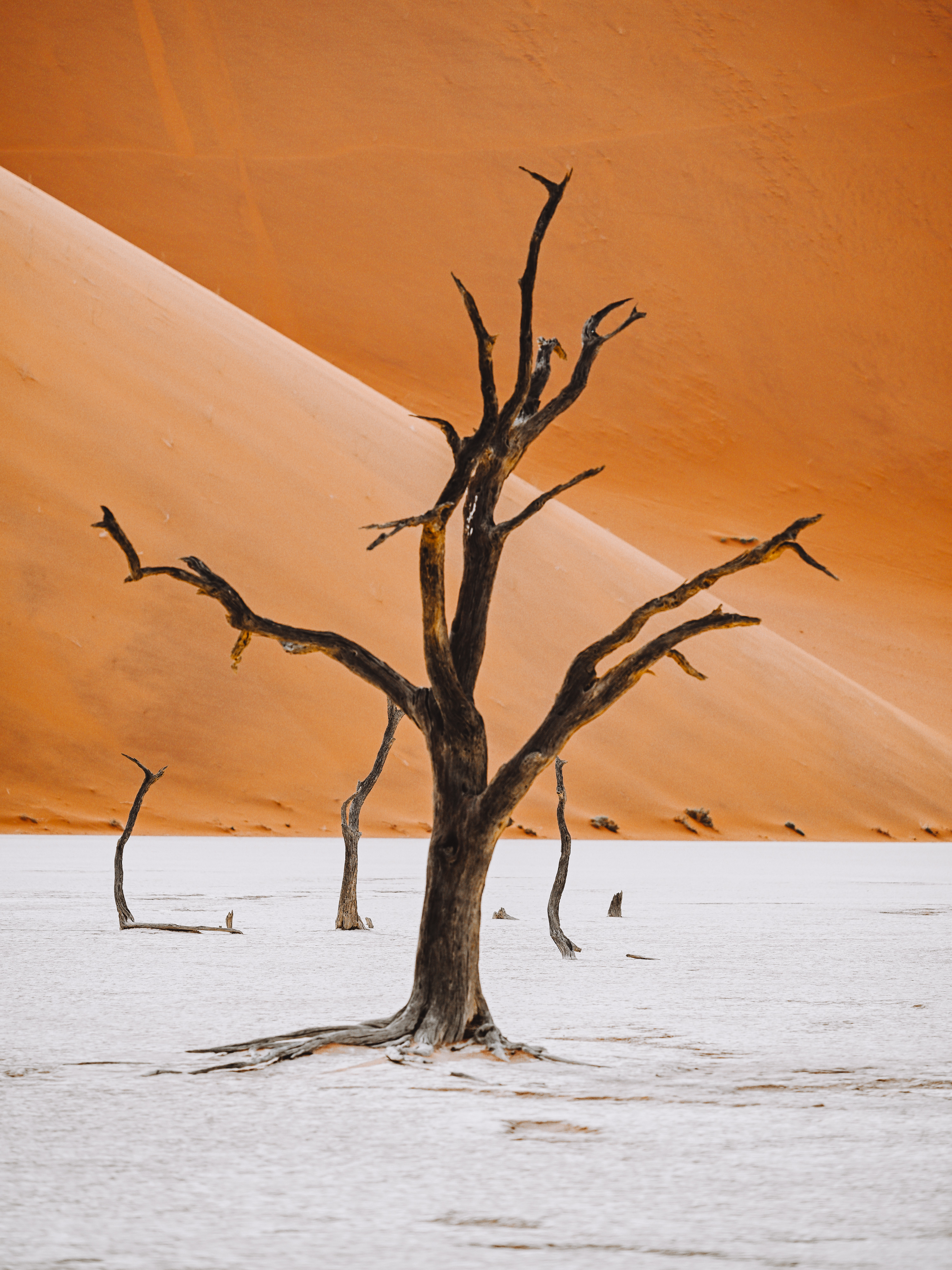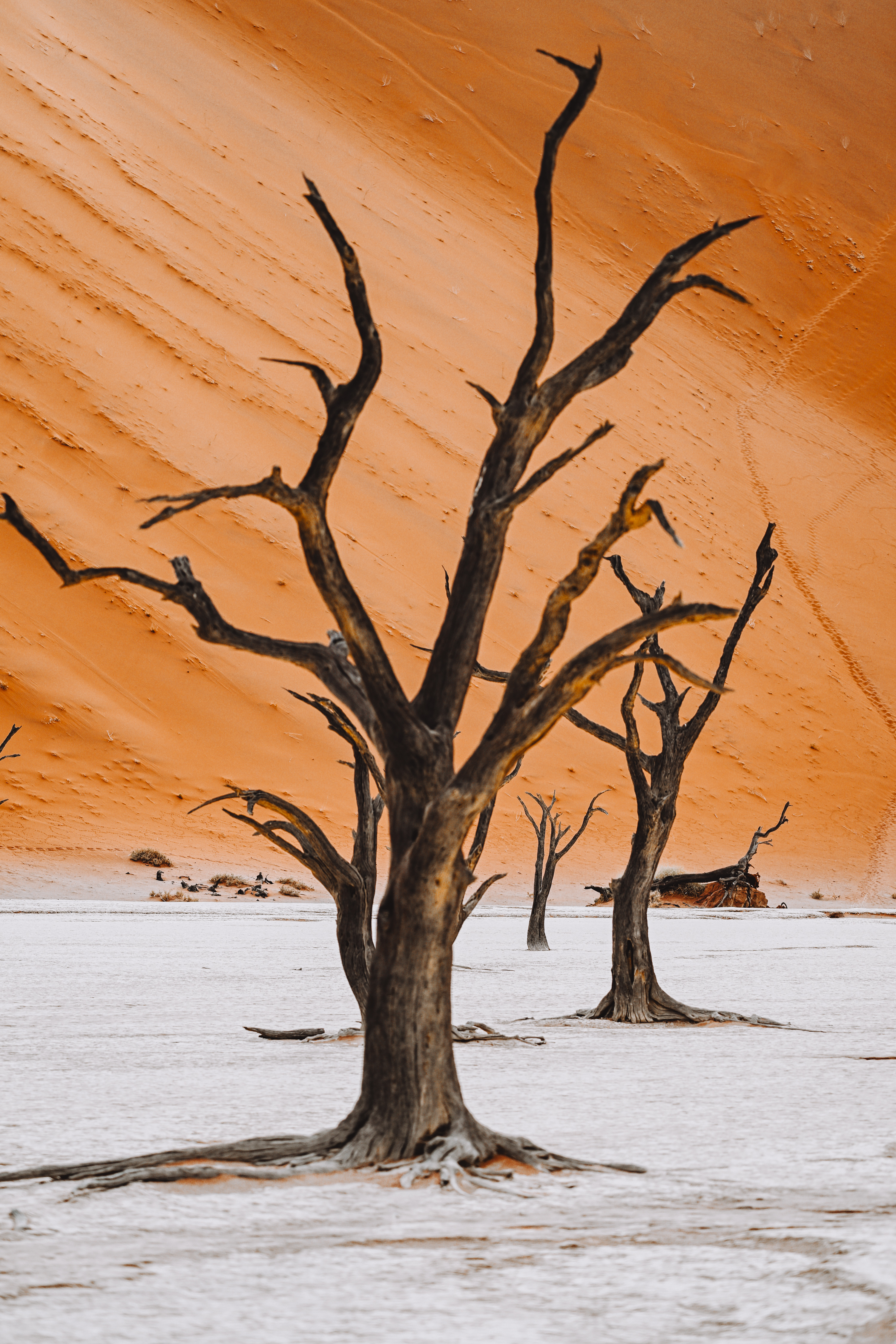 而漆黑的枯树干和白色的土层背后是铁红色的沙丘