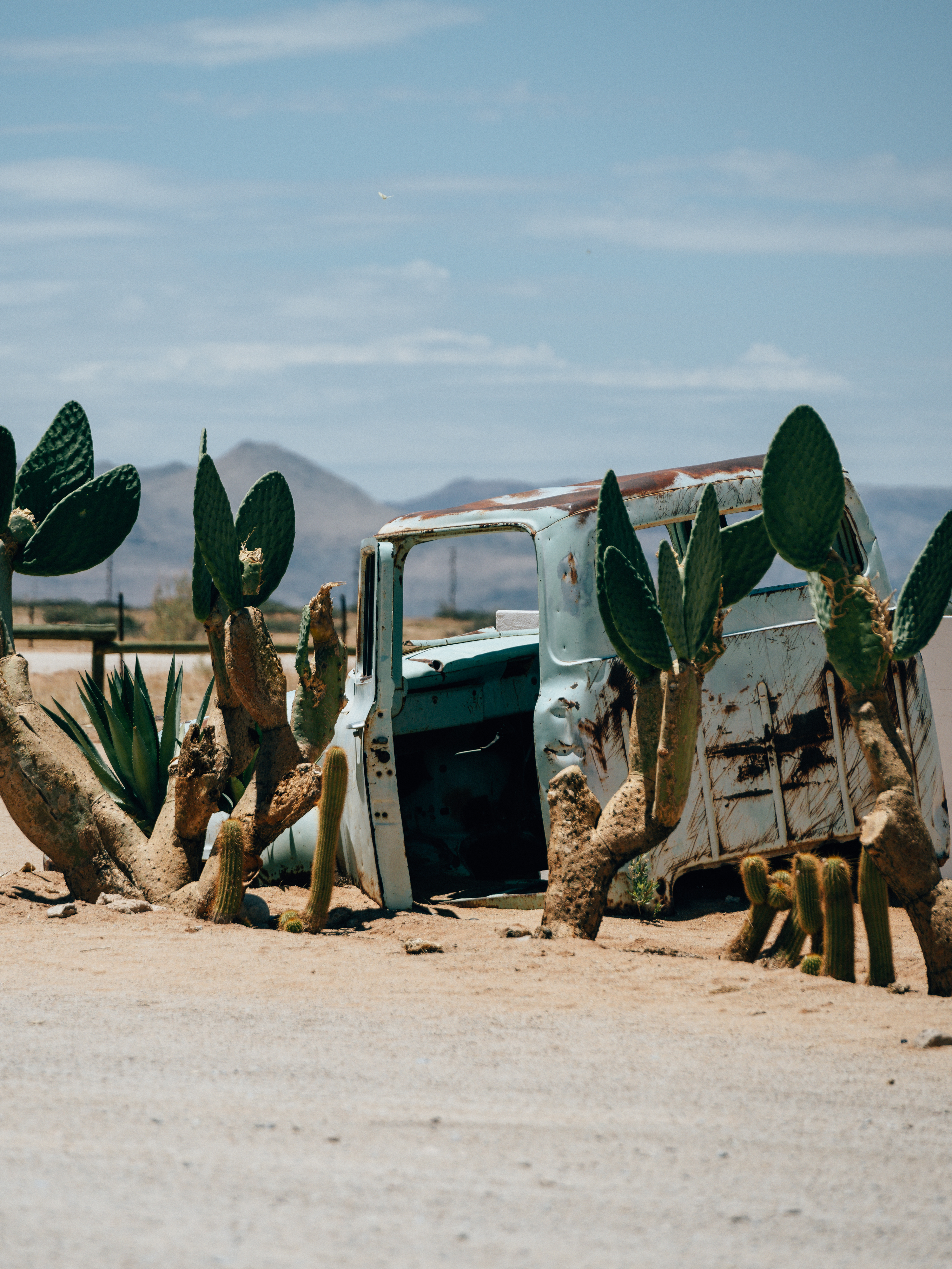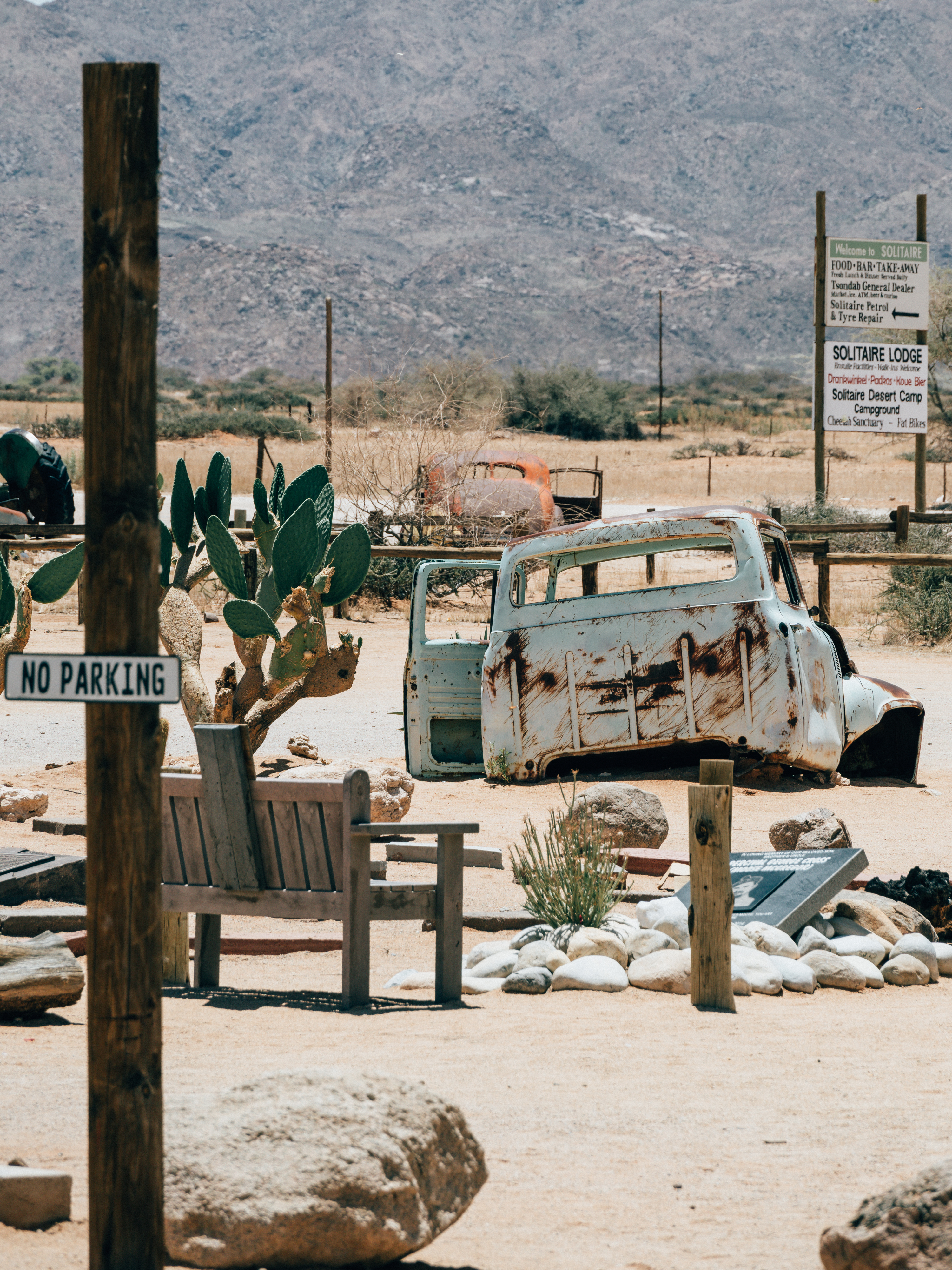 从纳米布沙漠去鲸湾的路上,经过一个叫Solitaire的小镇,这里是仙人掌和老爷车的世界。茫茫荒野中散落着各式老爷车,仙人掌和老爷车构成了一幅独特的非洲画面,给人一种浓烈的西部大片味。Solitaire小镇是前往红沙漠途中唯一的中转站