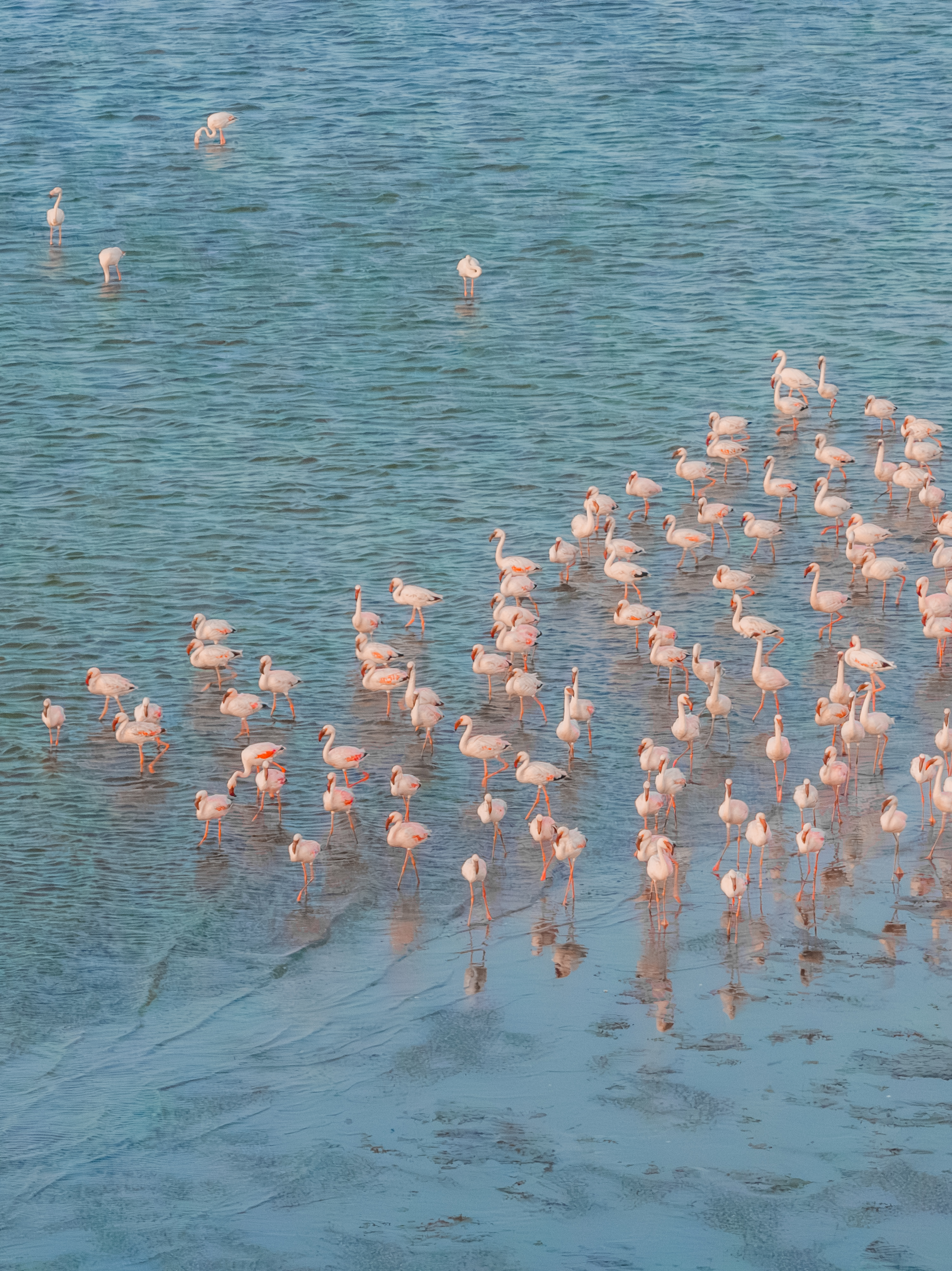 一天中的不同时候能拍到不同状态的火烈鸟,天冷了它们就缩成一团像鹌鹑,天暖了它们就喳喳喳的在岸边觅食