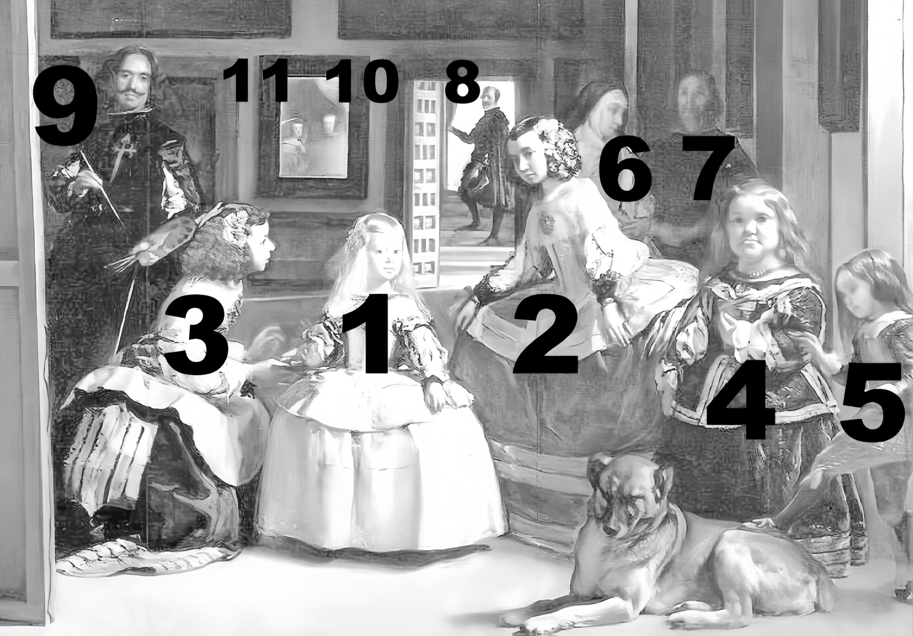 10和11.镜子中的是国王费利佩四世和王后玛丽亚纳,他们穿着正式,似乎正站在画面外的某个位置,委拉斯开兹巧妙地运用了反射的技巧,打破了传统的空间界限,使画中的人物和观众产生互动,镜子中的国王和王后象征着权力的中心,即使他们并不直接出现在画面前景中,这也展示了他们对整个宫廷生活的影响力。