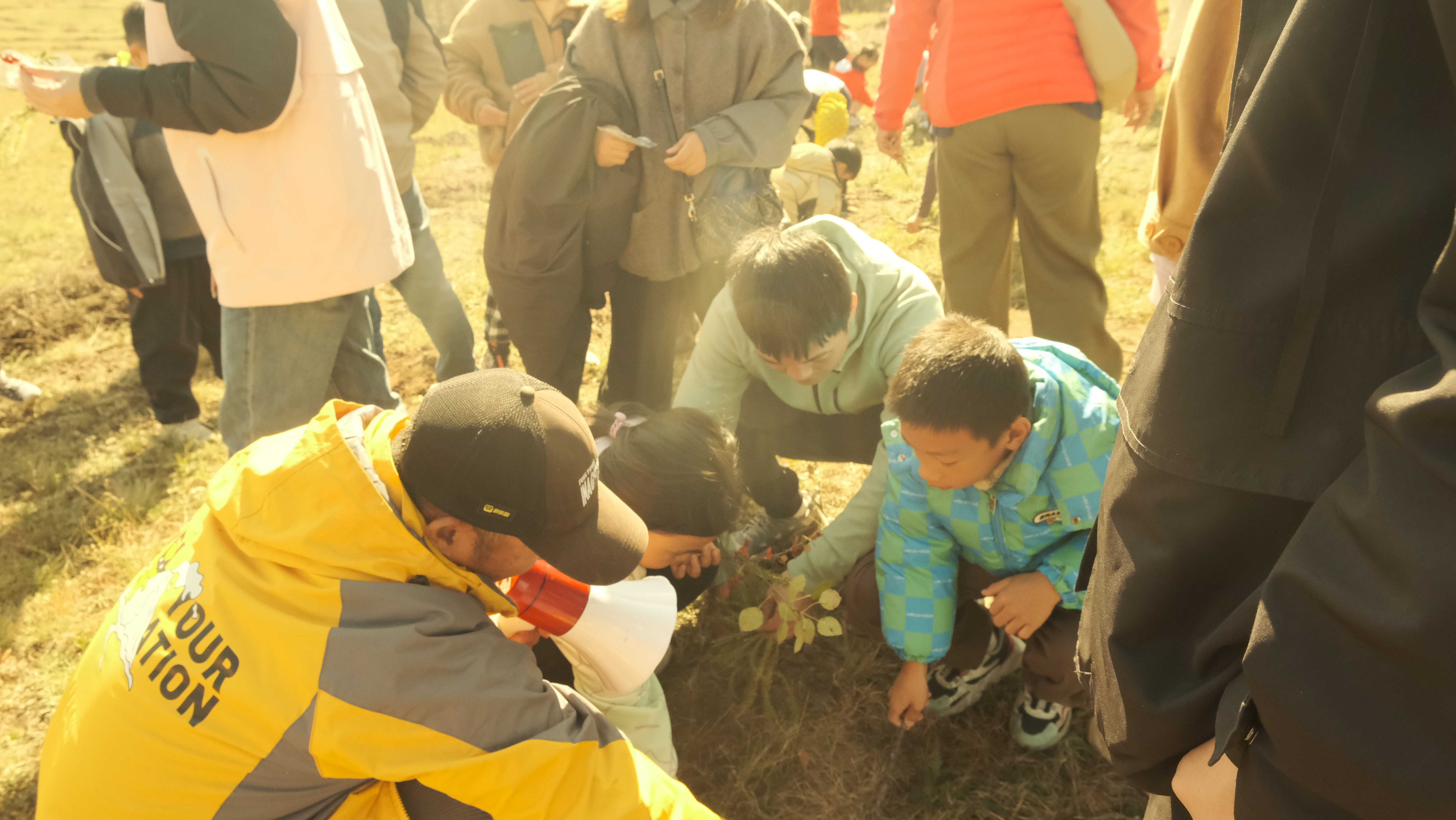 1小时左右前往塞罕坝植树体验,植树过程中有护林员分享塞罕坝故事,教小朋友植树,同时需要小朋友徒步前往河边打水,体验植树造林的不易,大朋友们在一旁协助