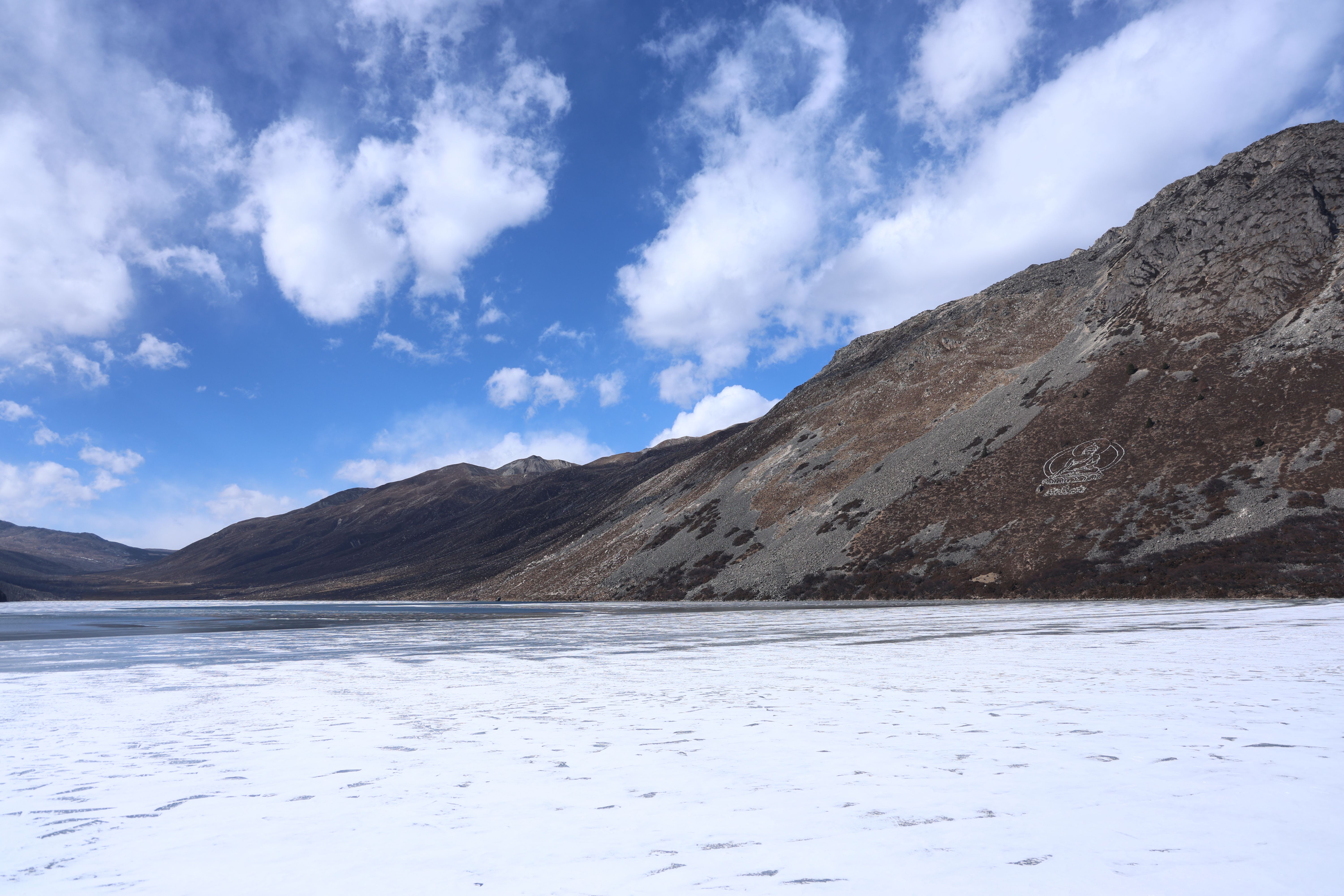 木格措在正午的烈阳下化作一枚巨大的棱镜。野人海的冰面不再是沉睡的蓝宝石,而成了光的炼金炉——阳光在冰层裂纹间折射出金线,将湖心切割成无数菱形光斑。午日轮西斜三刻,冰湖开始上演光的变奏曲。冰层下的甲烷气泡群苏醒,每个气泡都裹着七彩光晕,如同封存的水晶琥珀。远山雪顶像被撒了糖霜的酥皮,在强光中蒸腾出氤氲的白雾。