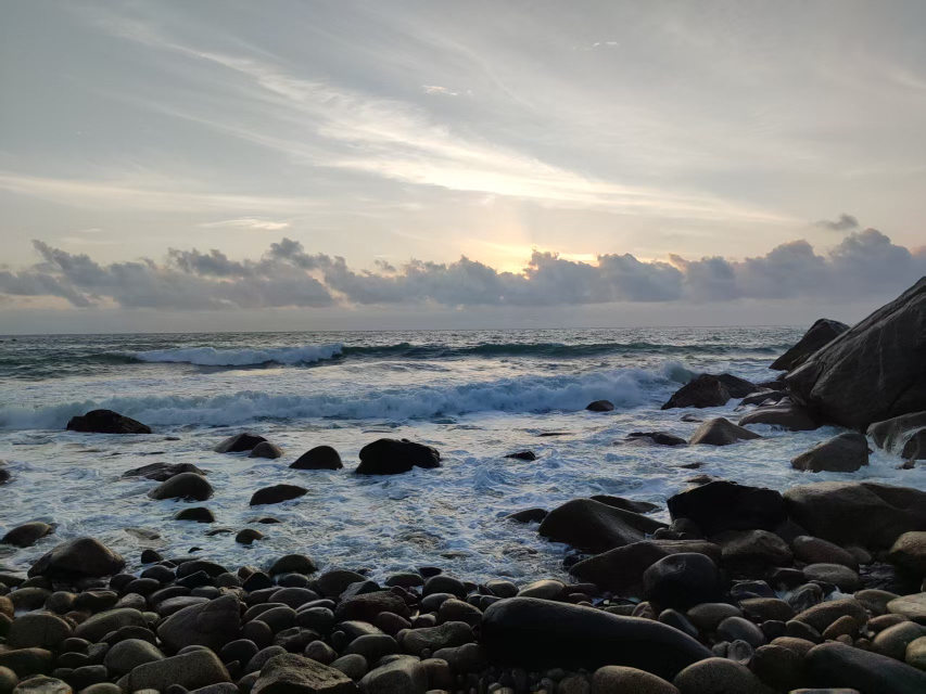 香水湾的日出同样令人难忘。我站在沙滩上,看着太阳从海平面升起,将天空和大海都染成了金黄色。海浪拍打着沙滩,发出清脆的声音,我拍摄着这美丽的日出,感受着大自然的魅力。