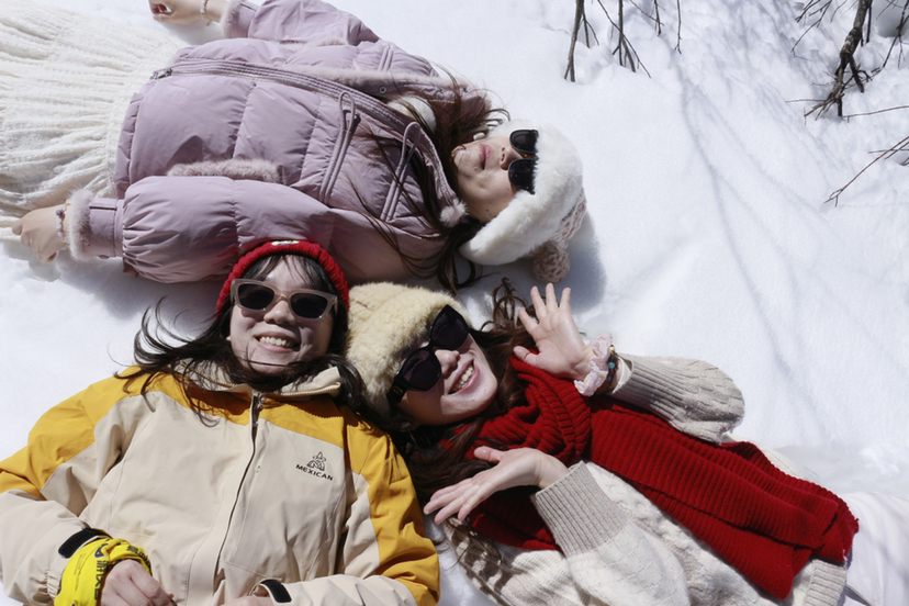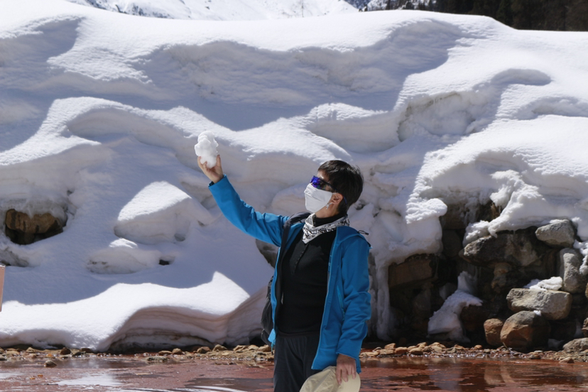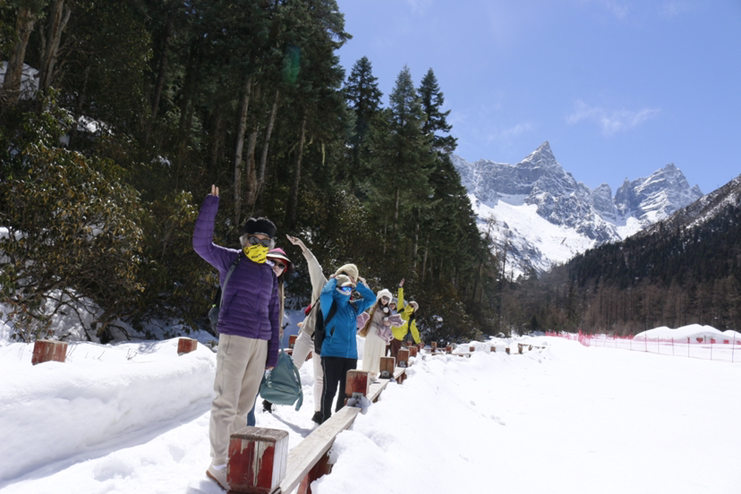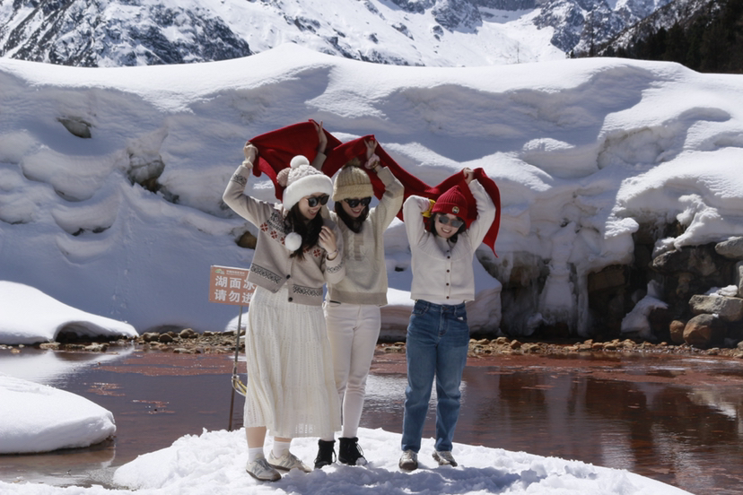 次日清晨开始我们的西行,海拔表指针不断攀升,植被由葱郁竹林渐变为苍劲松柏。当毕棚沟的雪峰撞入眼帘时,办有轻微高反的伙伴都忍不住的惊叹——四月的春风似乎在这里迷了路,原始森林披着银白铠甲,海子折射出孔雀蓝的光晕。阳光穿透稀薄空气,在雪地上织就细碎金箔,让人恍惚置身北欧童话。沿着木栈道深入秘境,不时能听见积雪从冷杉枝头坠落的簌簌声,像是雪山在轻声哼唱古老歌谣。