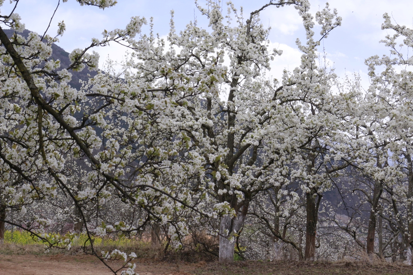 第三日的行程被染成了素白色。车过小金县境,忽见山谷间升腾起片片云霞,原是万亩梨园正值盛放。虬曲的老梨树枝干上,簇簇白花如新雪堆积,藏族阿妈背着竹篓穿行花海,绛红头巾在素白背景中跳动如诗行。面色红润的阿婆喜笑颜开,或许是对我的到来感到自豪,当地人说这些梨树最年长者已逾百岁,虬结的枝干记录着四季轮回的故事。风过时花瓣纷扬似雪,落在相机取景框里,恰成天然的诗笺。