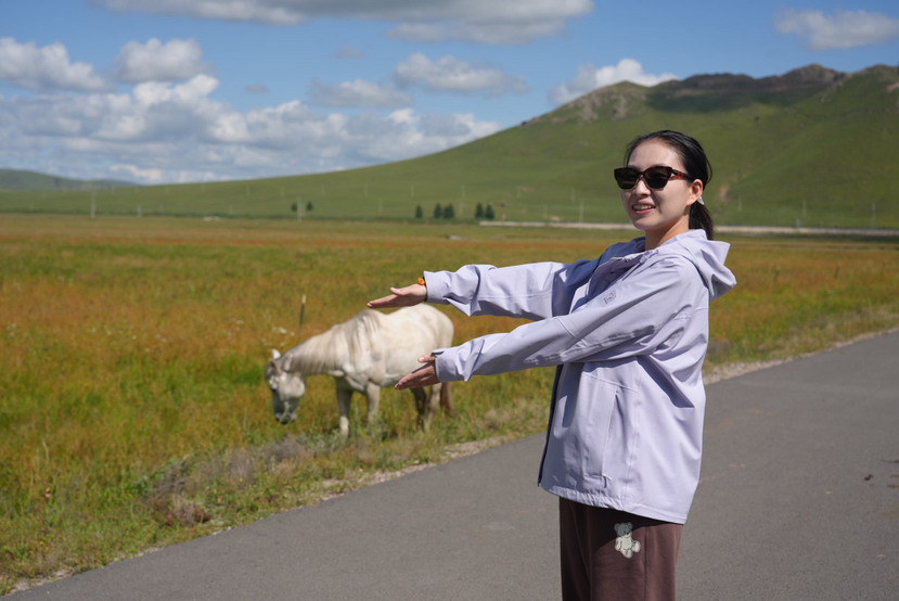 到了黑山头,坐在马背上,马背上的视角很特别,草原在脚下起伏,远处的额尔古纳河湿地闪着光。牧民家访,穿上蒙古袍,