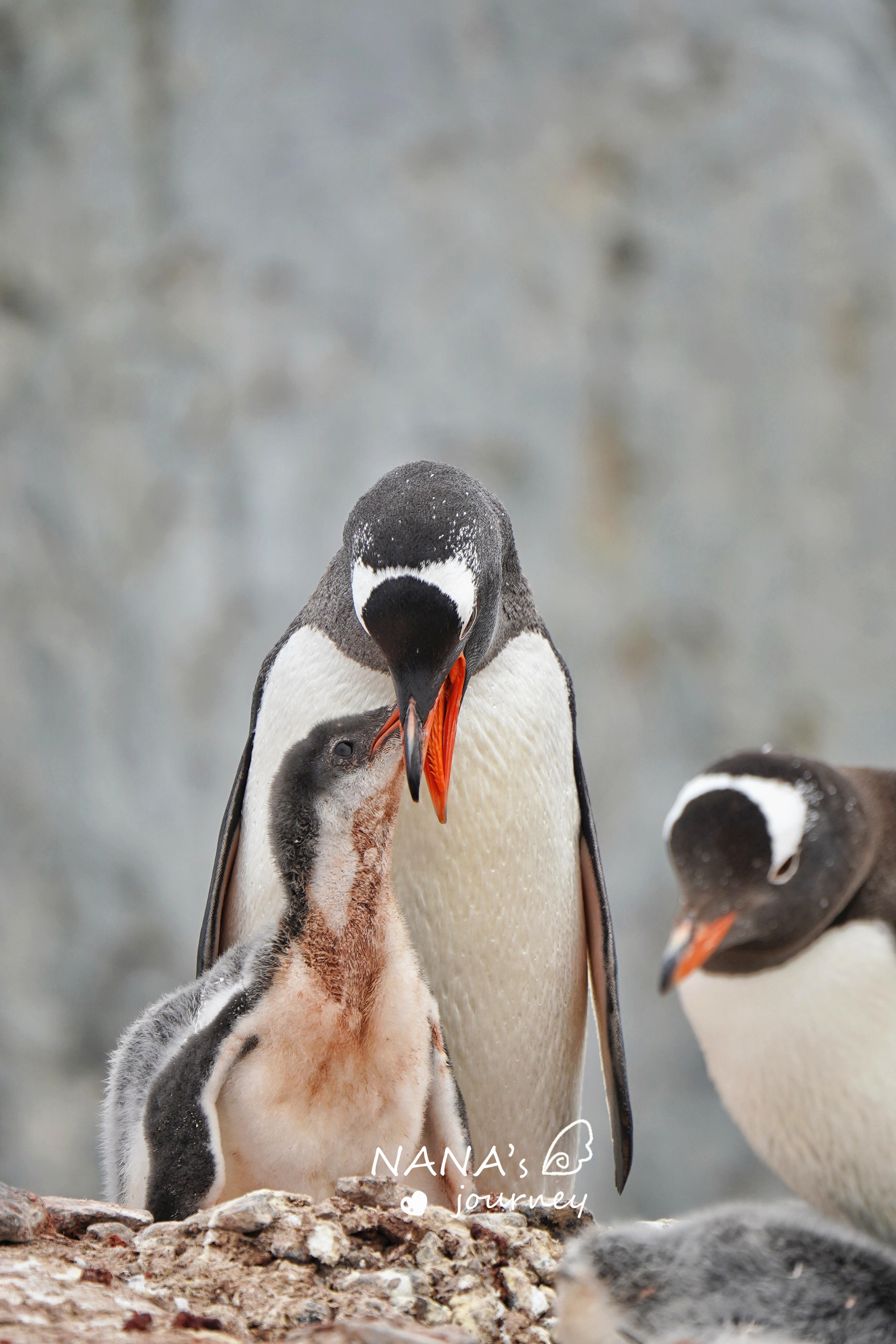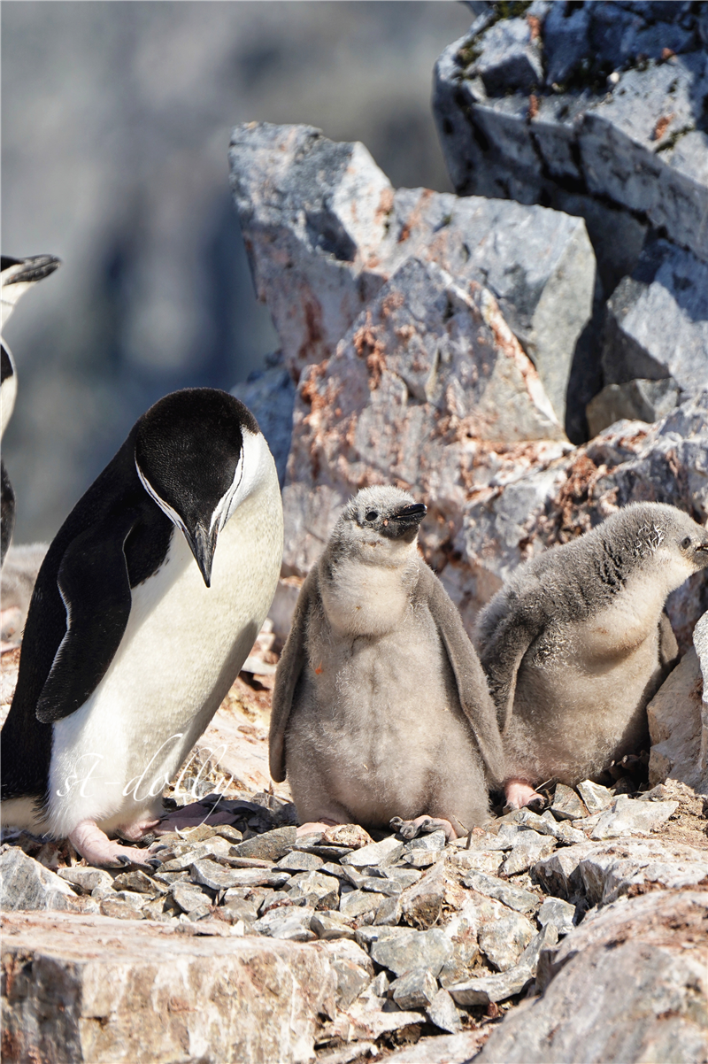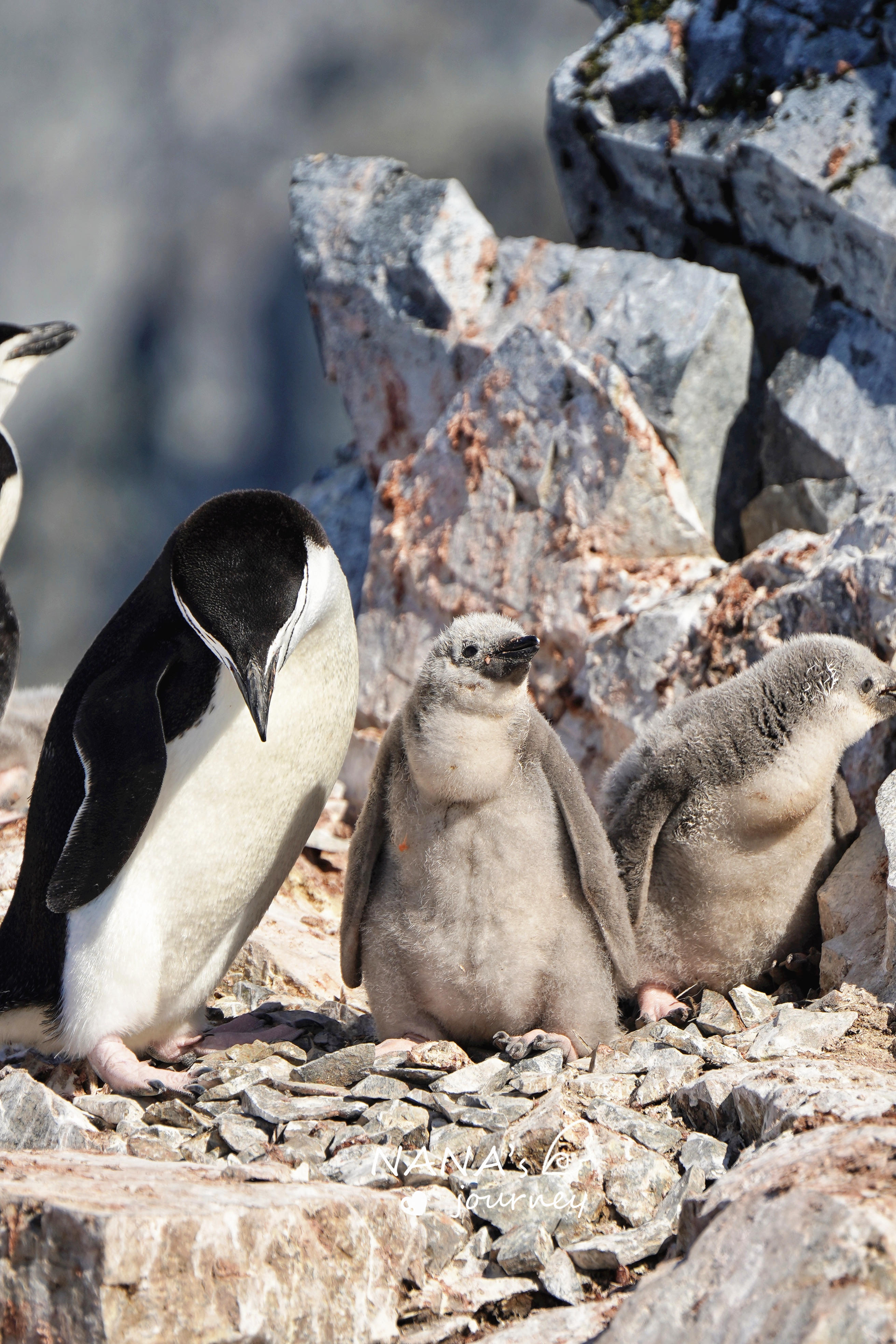 走到山路的尽头,大家来这里是为了看帽带企鹅的生活,他们在岩石的顶端产仔养仔生存,现在正好是帽带宝宝的生长期,没有长大的宝宝们灰灰的毛包裹着,好像猕猴桃一般,可可爱爱地呼叫着父母喂食。