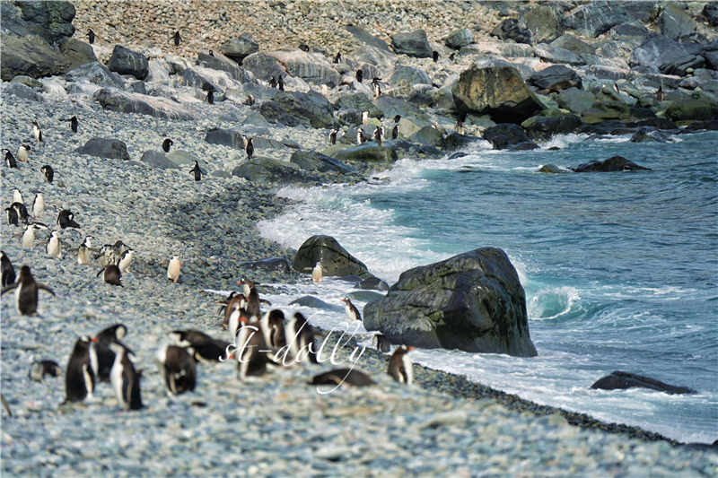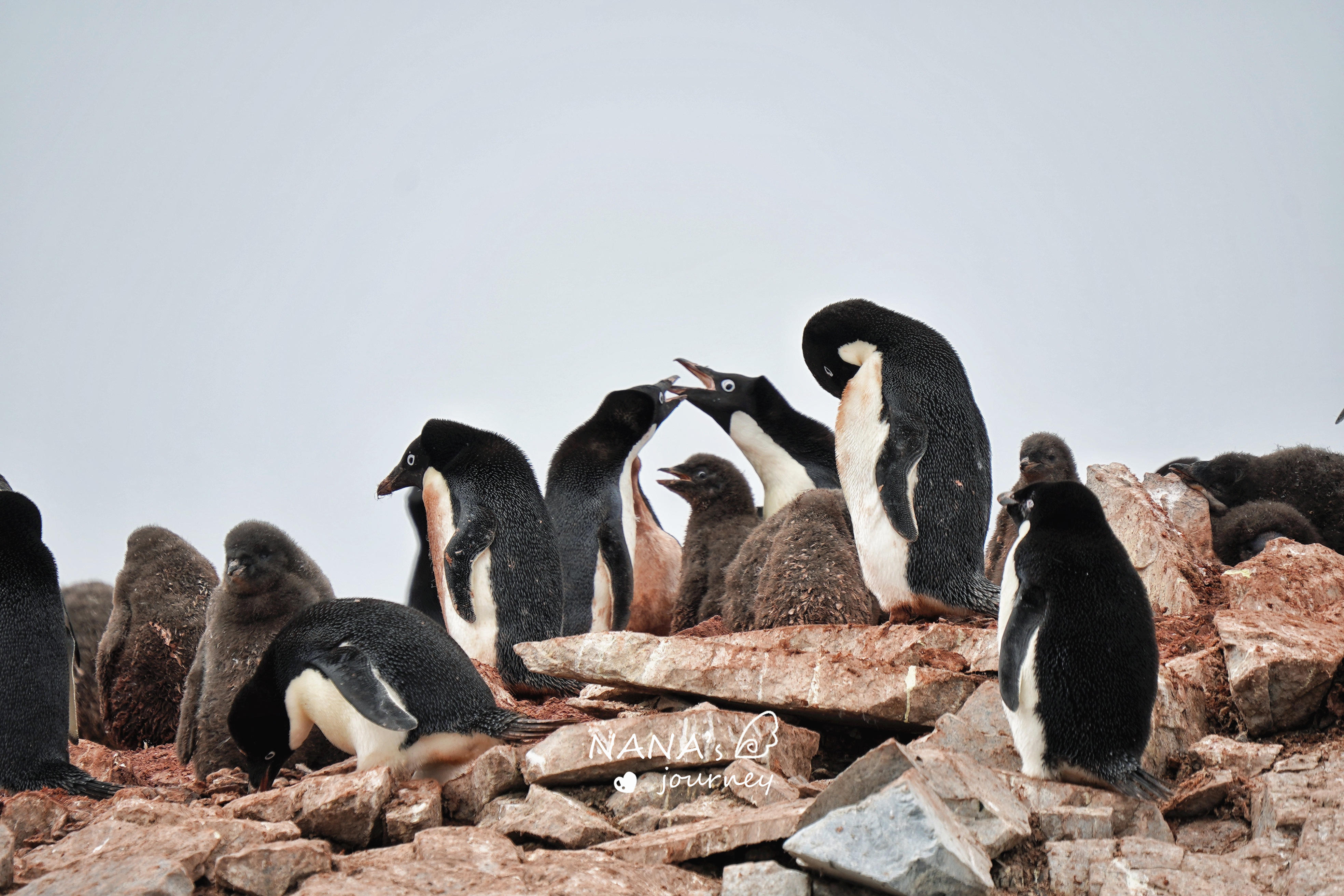 我们要去找阿德利企鹅的族群了,岛上的积雪比较厚,但因为夏天气温比较高,所以大多化成了水,走起来等于踩着各种水坑,虽然不好走,但是冲着见阿德利的心,也努力的前行着。那一块大礁石的最高处,满是阿德利企鹅的身影,我们只能远远看着他们的生活,正值喂养时间,每个家庭都努力的喂养着小企鹅们,让他们快快长大,不过因为孩子总有不乖巧的,所以企鹅的叫声充斥在天空中,像极了父母管教ing。